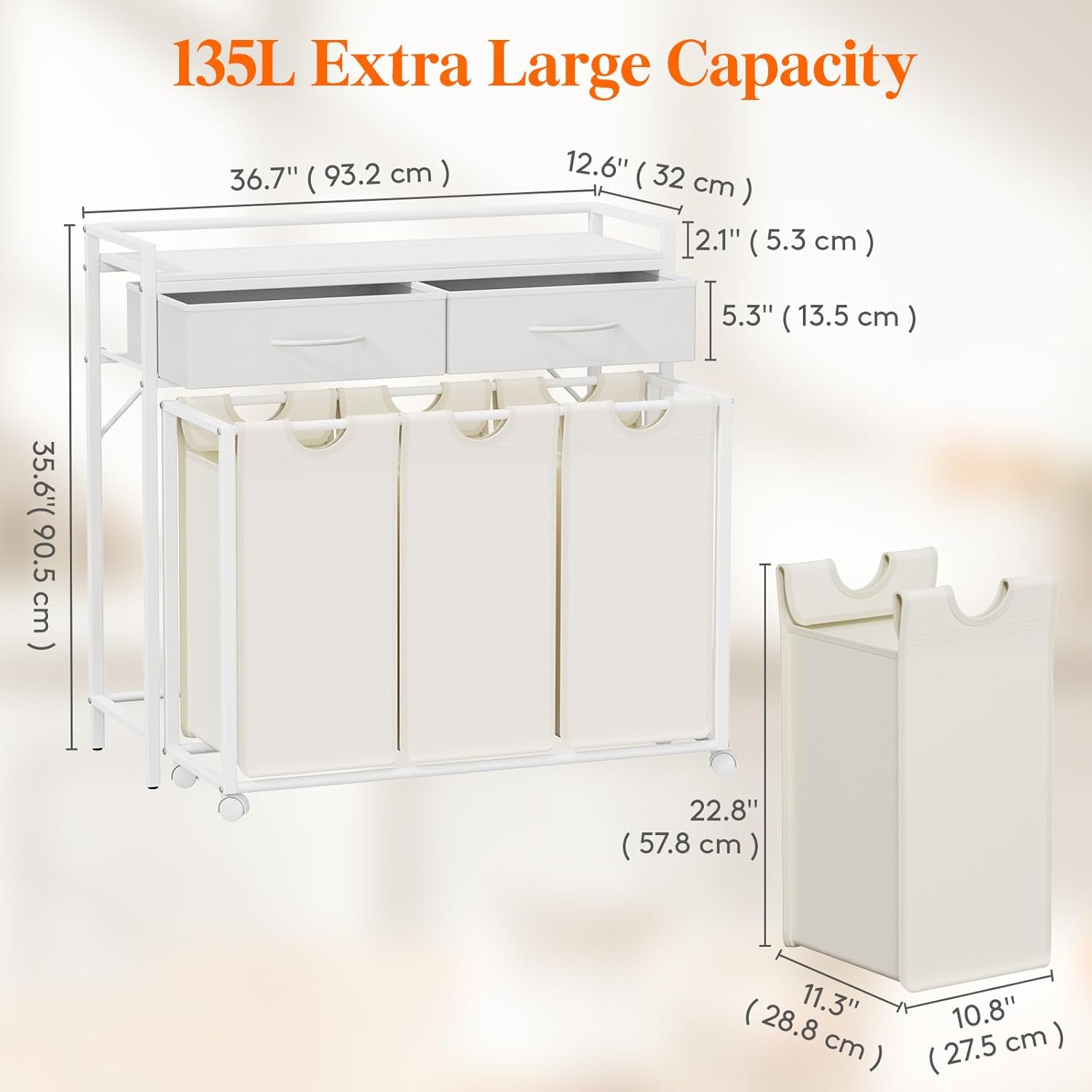 Lifewit Laundry Hamper 3 Section, Large Rolling Laundry Sorter with Shelf & 2 Drawers, Pull-Out Laundry Basket Organizer with Wheels and Removable Bag, White and Beige