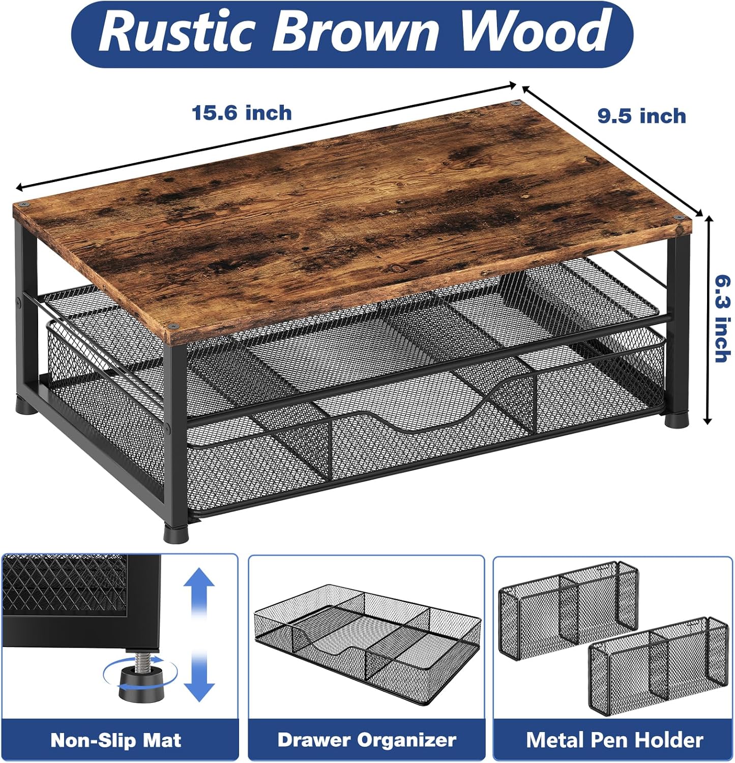 Desk Organizers and Accessories, 2-Tier Computer Monitor Stand Riser with Drawer and 2 Pen Holders, Laptop Stand, Office Desk Accessories for Office Supplies, Brown