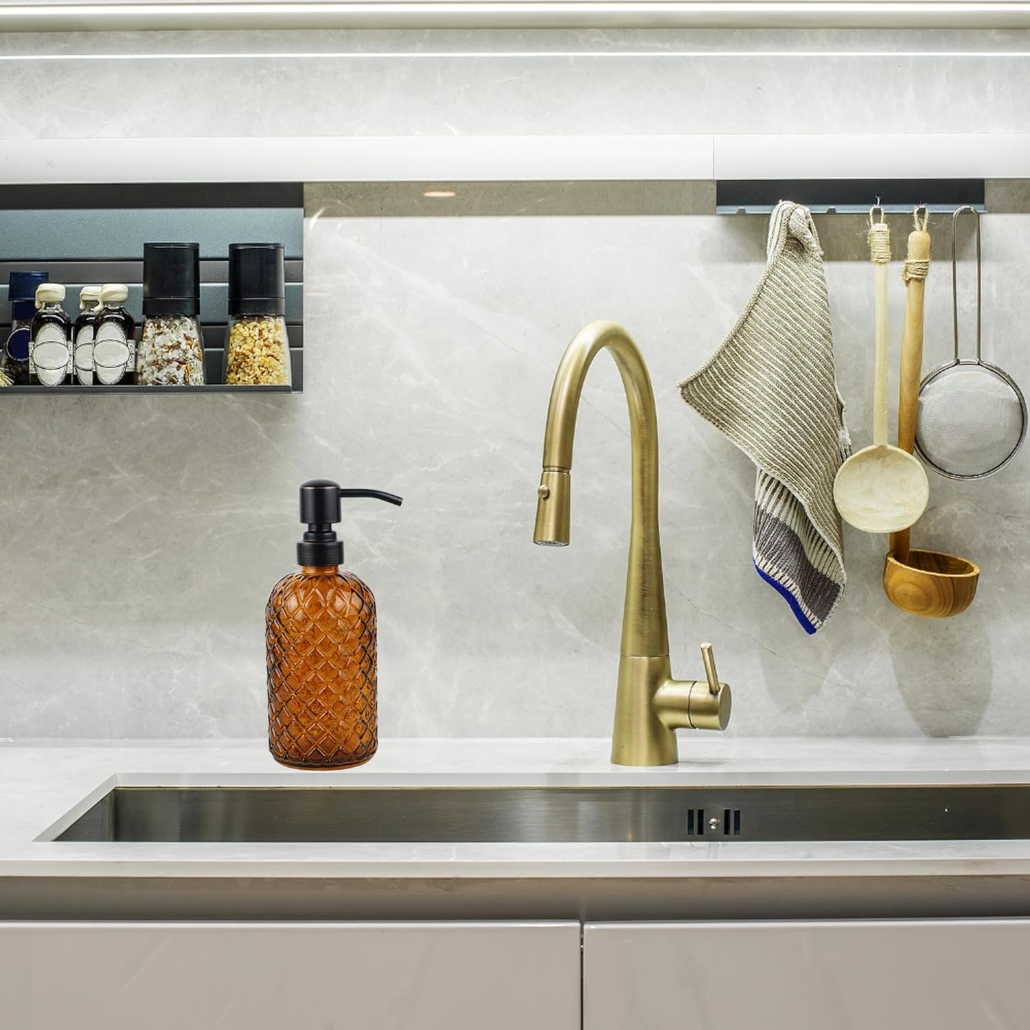 16 oz Glass Soap Dispenser with Stainless Steel Vintage Brushed Bronze Pump Head, Refillable Gemstone Pattern Soap Dispenser for Hand Soap, Dish Soap, and Lotion (Amber)