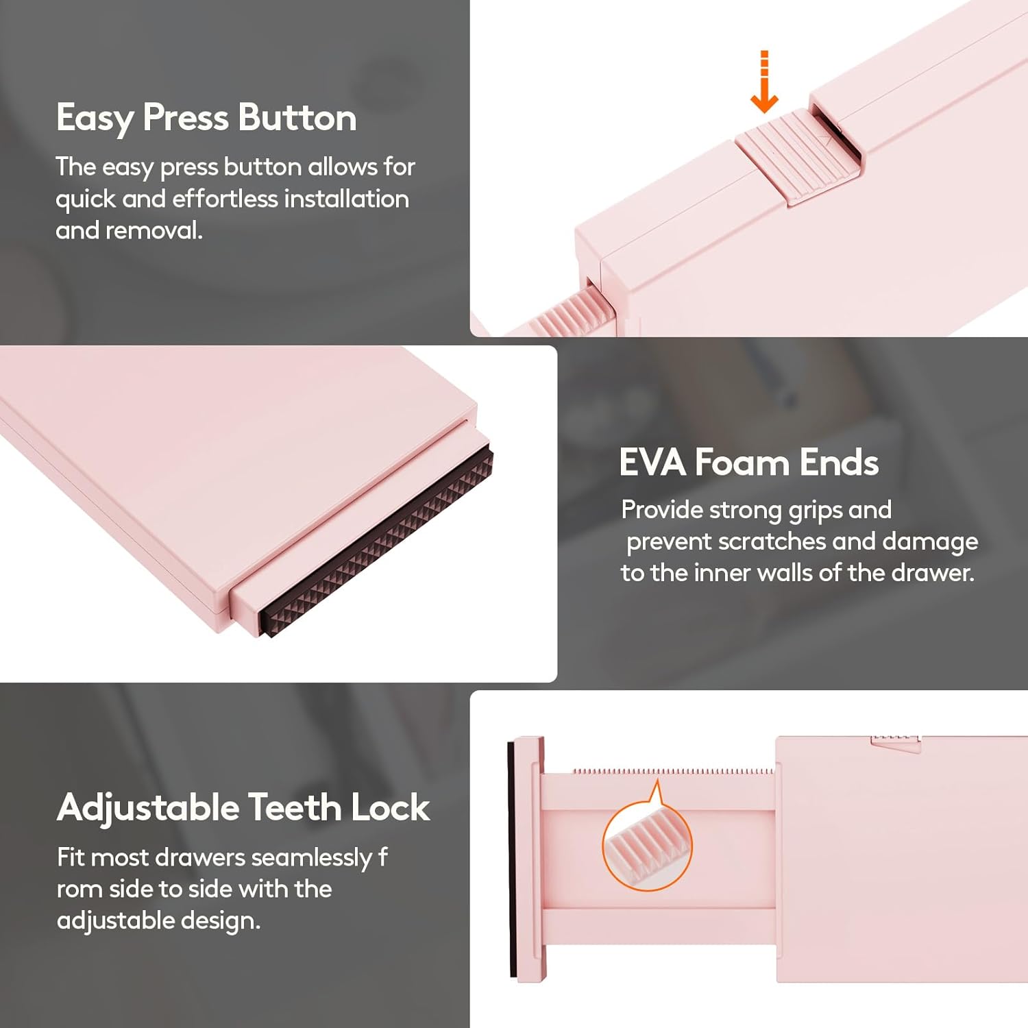 - Easy to Install: Press the top button and stretch to the desired length, then fully extend again to secure in place; The strong spring tension keeps each drawer organizer securely upright; To retract, press the top button and push the stretched side
