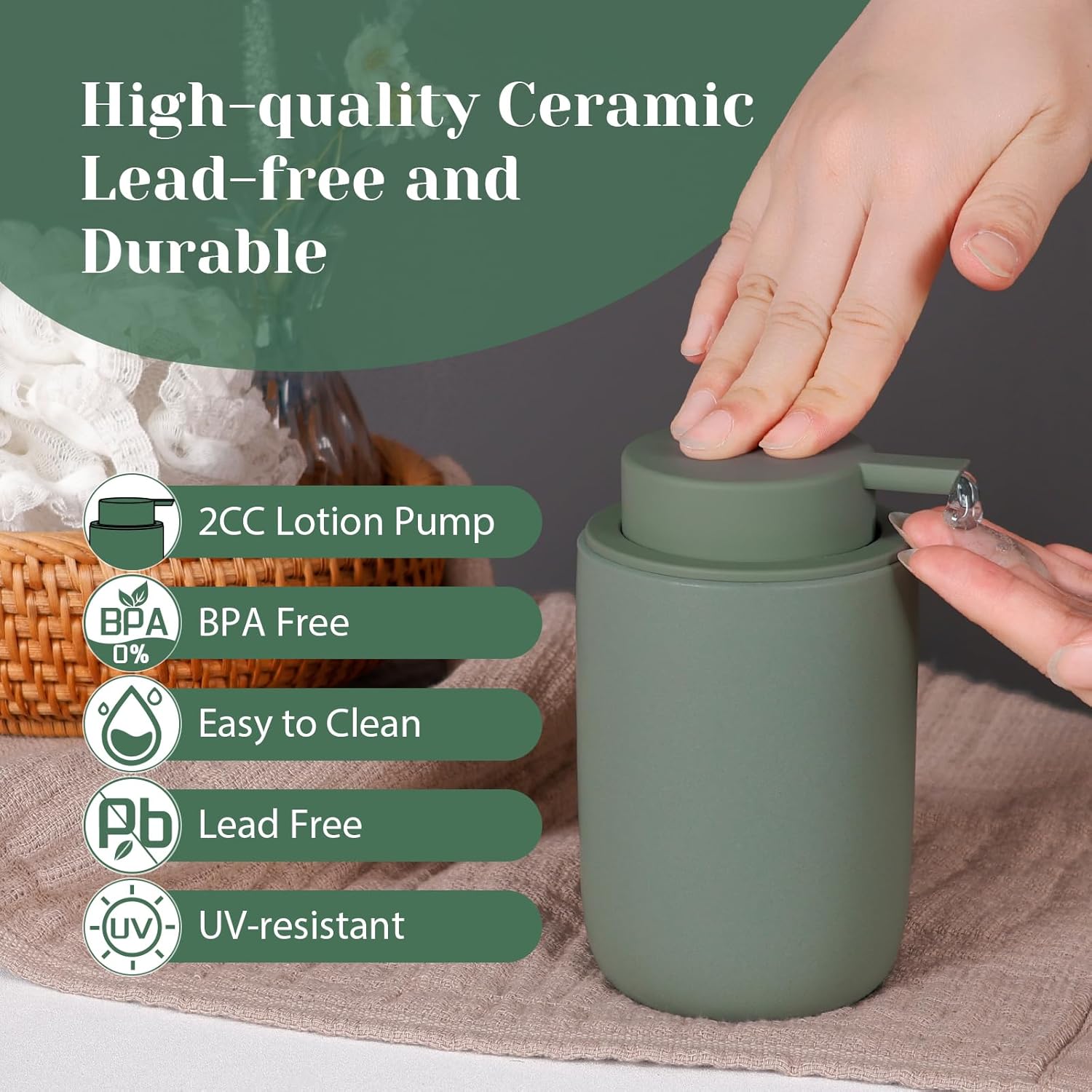 INGOFIN Ceramic Lotion Soap Dispenser Set, 2 Pack (12 oz) Bathroom Hand Soap Dispenser with Pump, Liquid Hand and Dish Soap Dispenser Set, 8 Pcs Clear Stickers, for Kitchen Bathroom-Matte Green