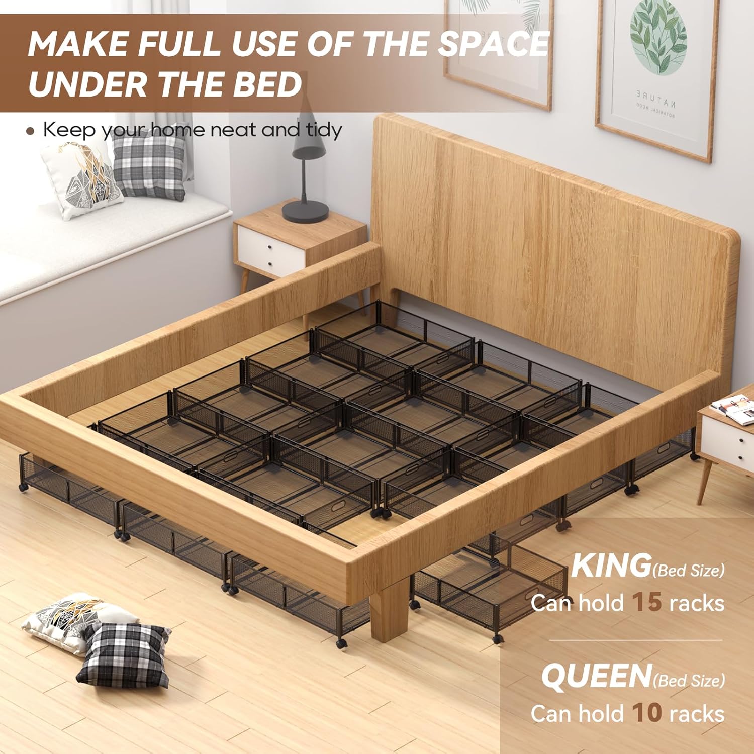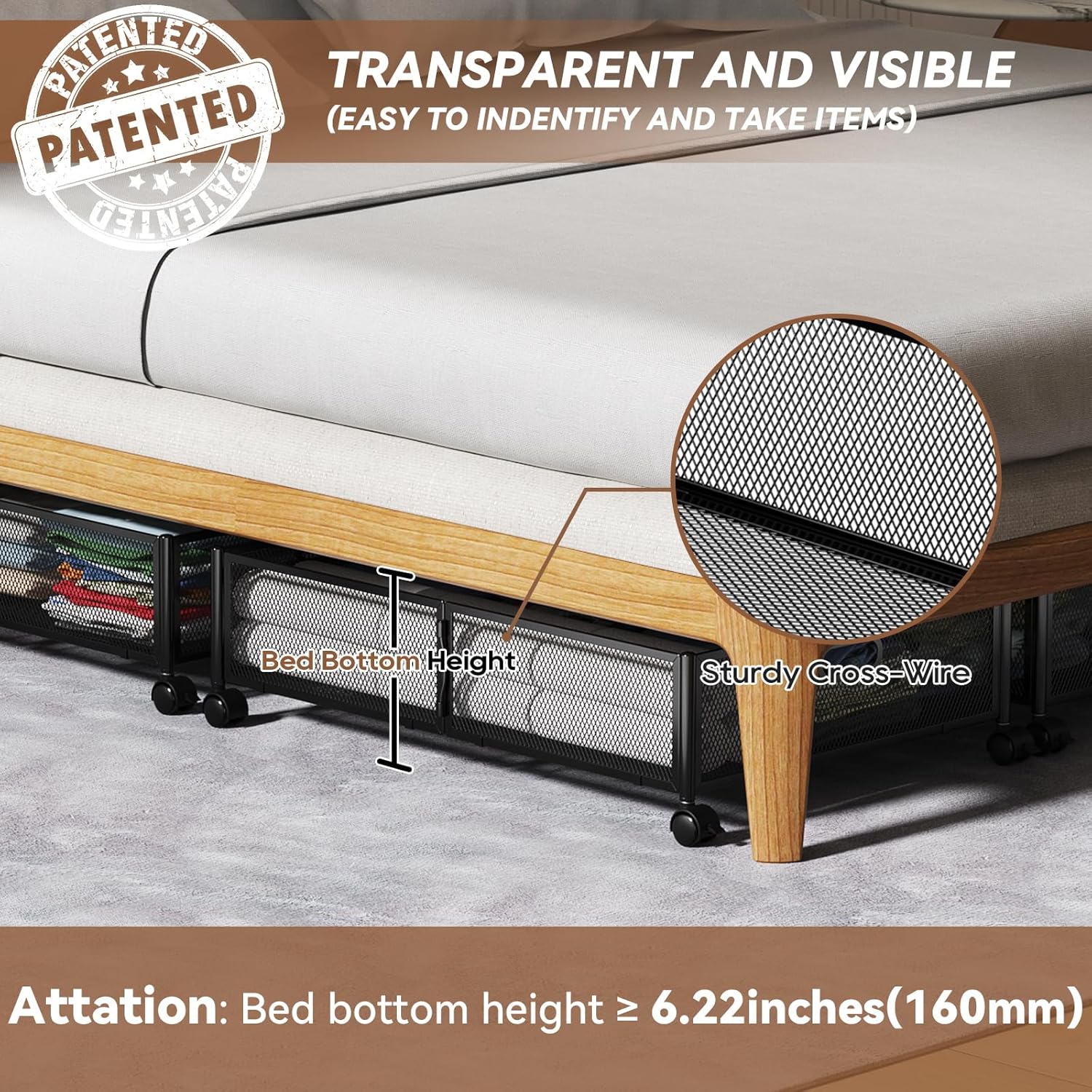 - [Quality Metal Container] Never settle for flimsy plastic&linen under bed storage bins which rip all too easily. This under the bed storage container is completely made of metal, compared with other under bed storage bins, smaller mesh size of the shelf is used for a larger load-bearing capacity. Plus, the whole frame was welded into a whole that never falls apart.