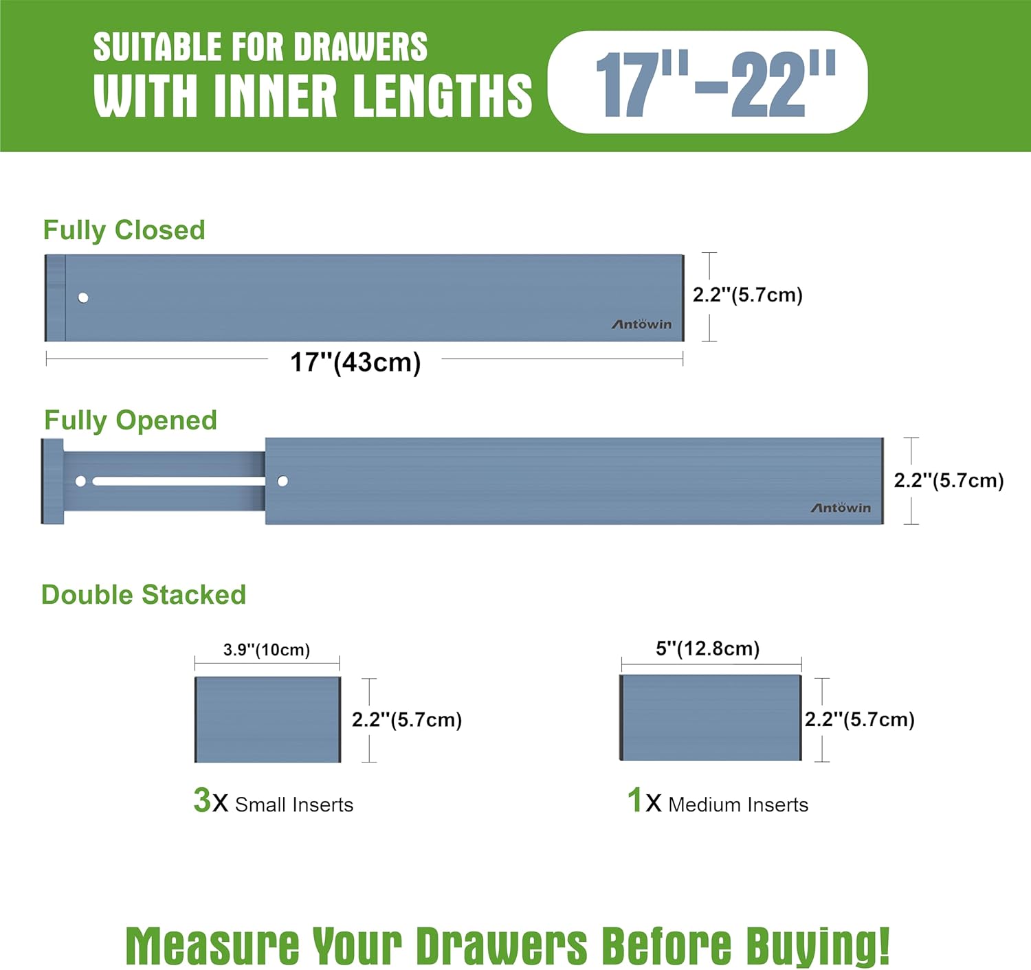 - Expandable Drawer Organizer: Each Measures 17" x 2.2" x 0.6" ; Expands from 17" to 22" long. 3 pcs Small drawer divider Measures 3.7" x 2.2" x 0.6" .