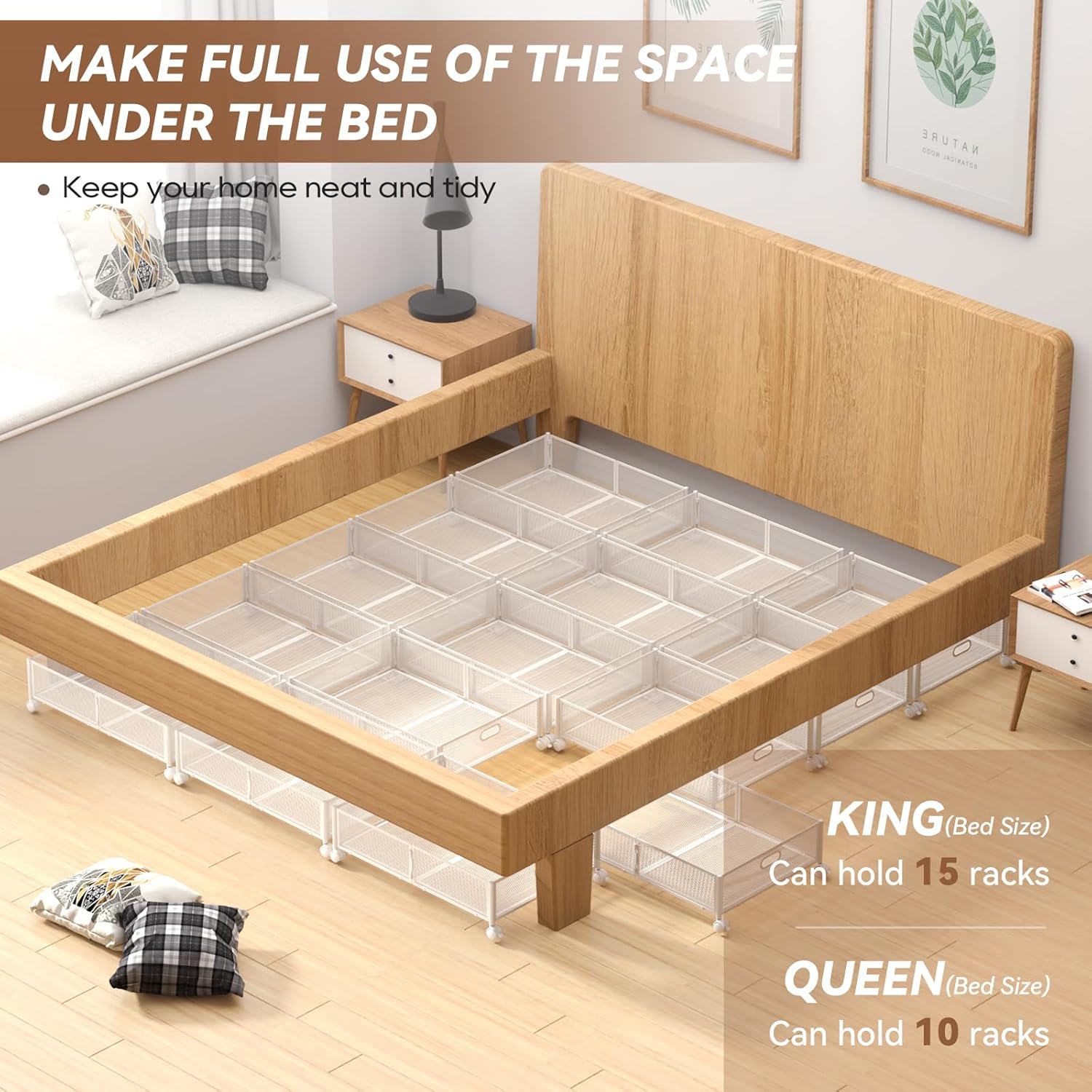 - [Quality Metal Container] Never settle for flimsy plastic&linen under bed storage bins which rip all too easily. This under the bed storage container is completely made of metal, compared with other under bed storage bins, smaller mesh size of the shelf is used for a larger load-bearing capacity. Plus, the whole frame was welded into a whole that never falls apart.