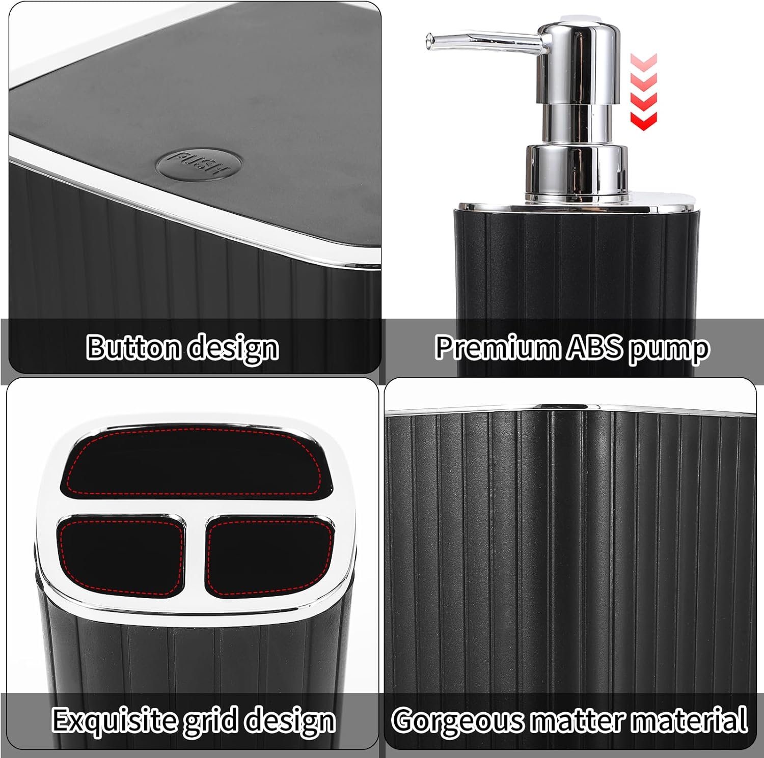 - MATERIAL: Bathroom accessories set made out of premium plastic, think and sturdy. The pump head is coated stainless steel paint, prevent rust and corrosion. The various accessories inside satisfy your use of the bathroom set. Buy this bathroom accessories set, you will not need to purchase additional products. Our set is fully covered.