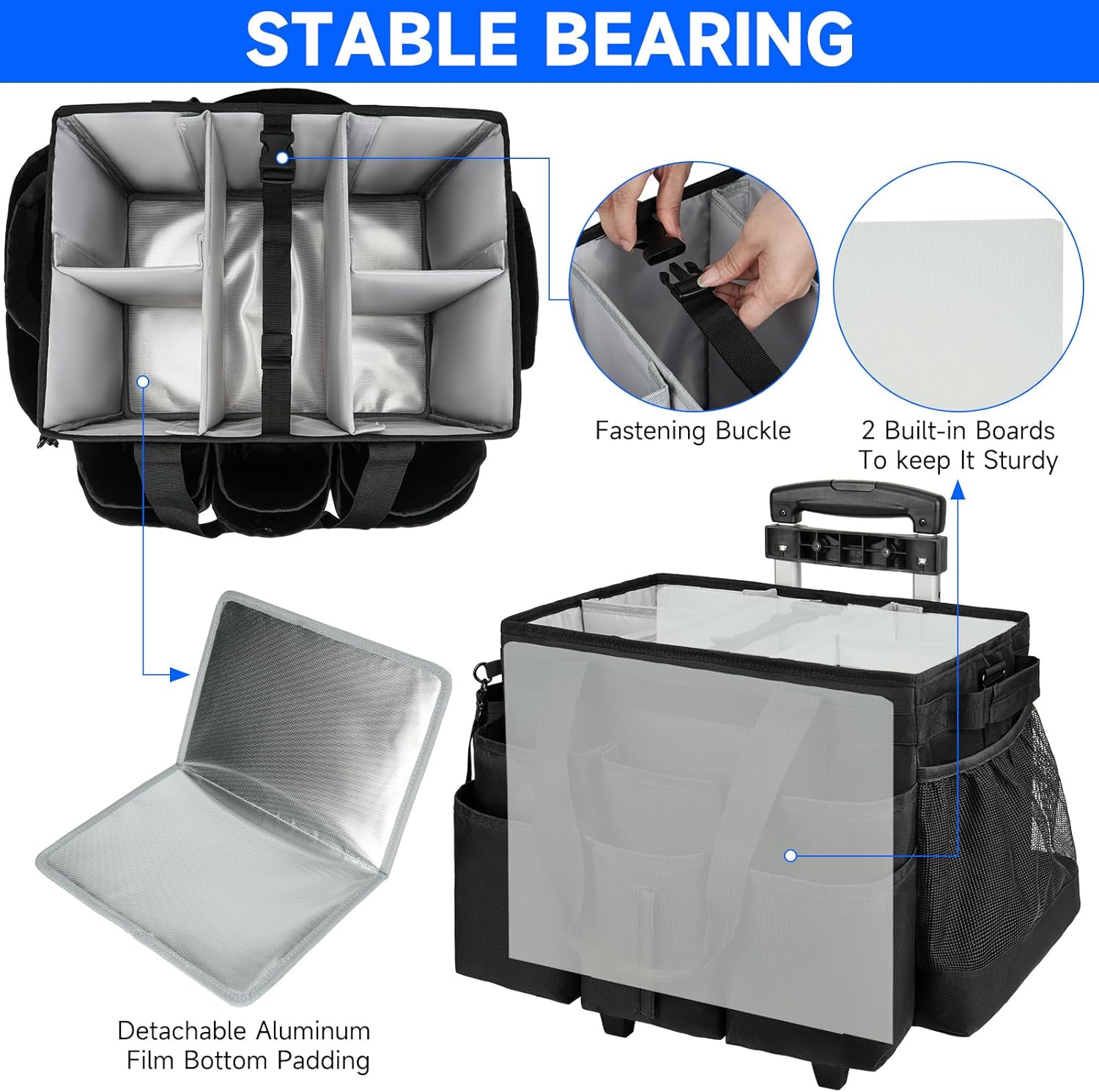Large Rolling Cleaning Caddy Bag with Detachable Trolley,Cleaning Cart on Wheels with Shoulder Strap,Cleaning Supplies Organizer for Housekeepers,Black