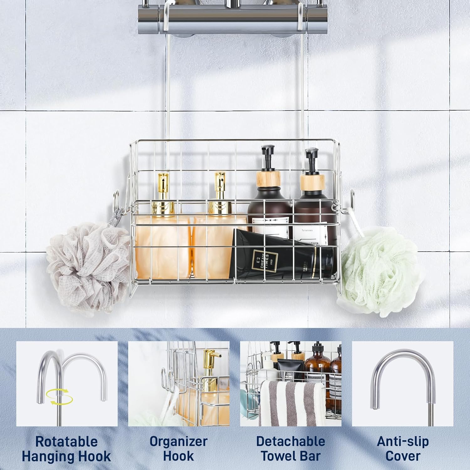 Hanging Shower Organizer, Shower Caddy Hanging, Bathroom Storage Rack with Hooks Over the Door, Stainless Steel Rustproof Bathroom Basket Shelf for Bath Faucet or Cross Bar