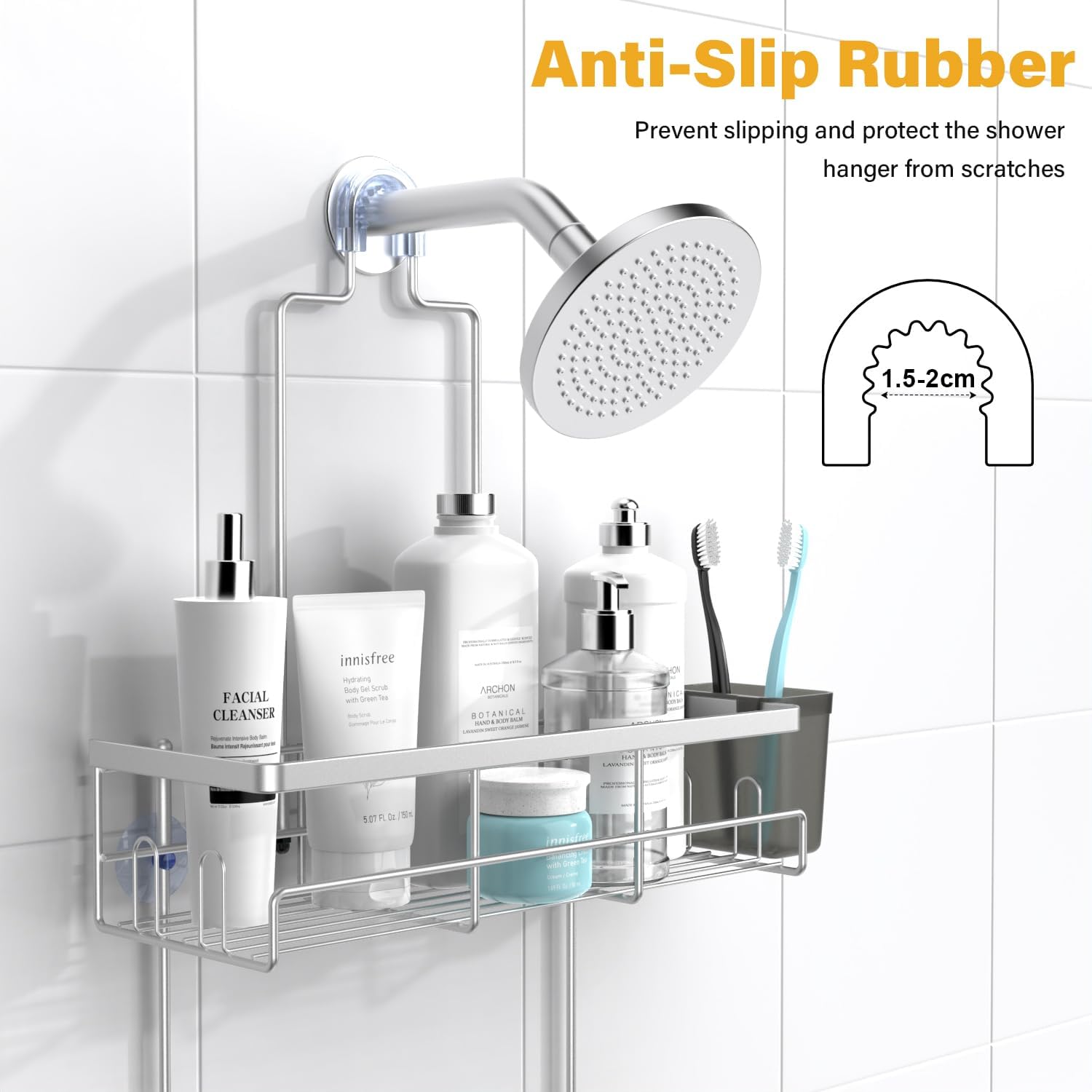 - Strong Suctions & Anti-Slip Collar: 4 suctions is super sticky for flat surfaces, which holds the entire organizer in place without wobbling and shaking. The overhead bathroom shelves with anti-slip collar at the top, so you don't have to worry, it stays safely stable on your shower head. Even if the shower organizer is full of bottles, the shower shelf will remain stable. It also won't lose its balance when you take the bottle in and out of the shower shelves.