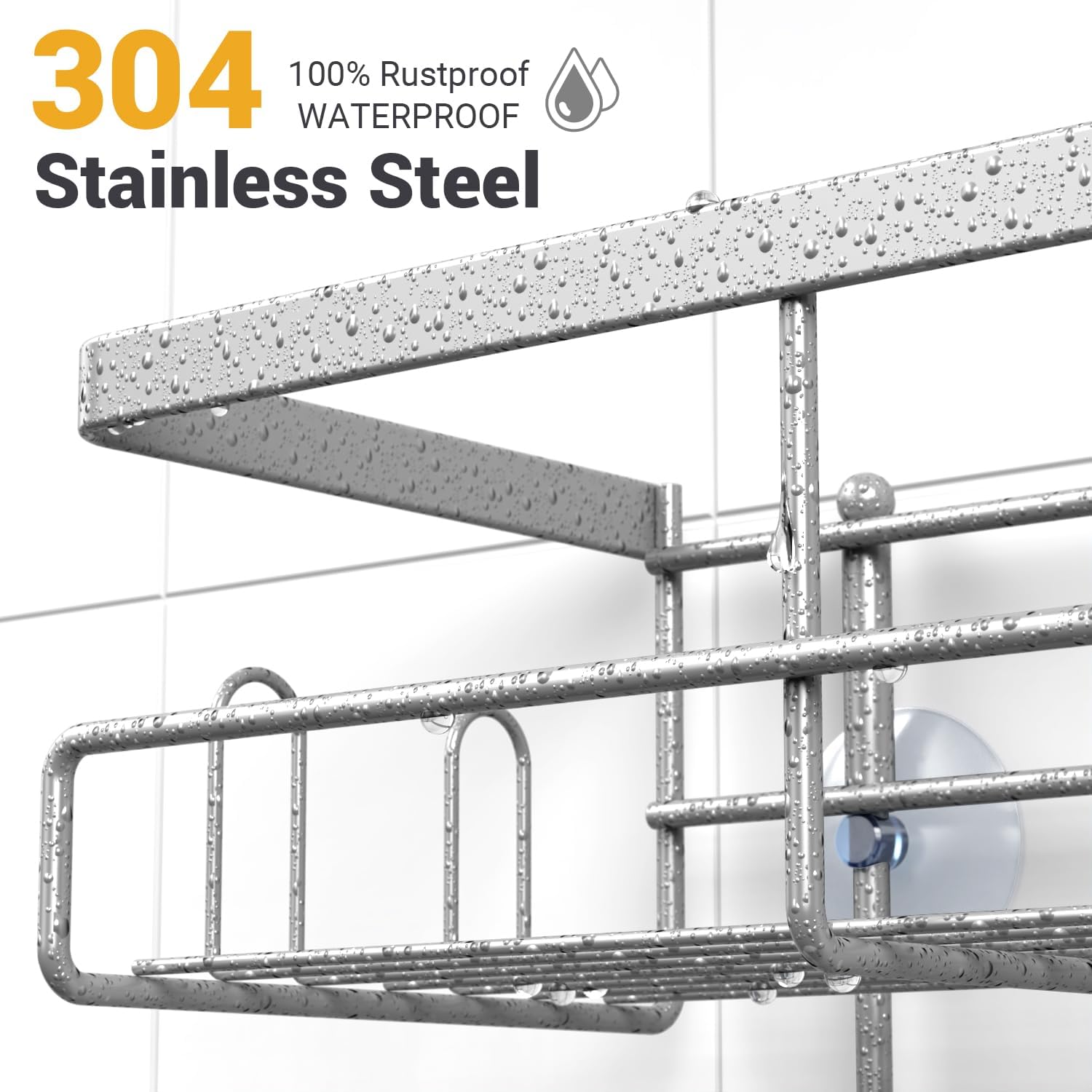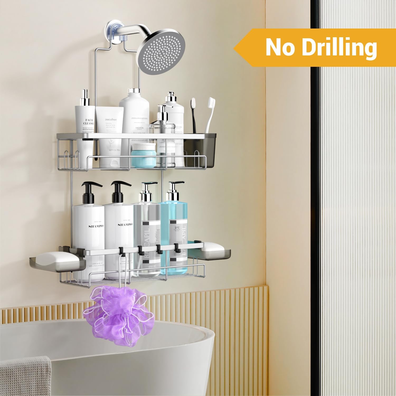 - Easy Installation with No Drilling: To install our bathroom storage shelf, no drill and no hardware. You just need to insert the lower part into the upper pipe of the shower rack, then screw on the screws, hang two baskets, place the shower shelf above the shower, then fix the suctions, and you are done, you can enjoy your cozy bathroom relaxation time.