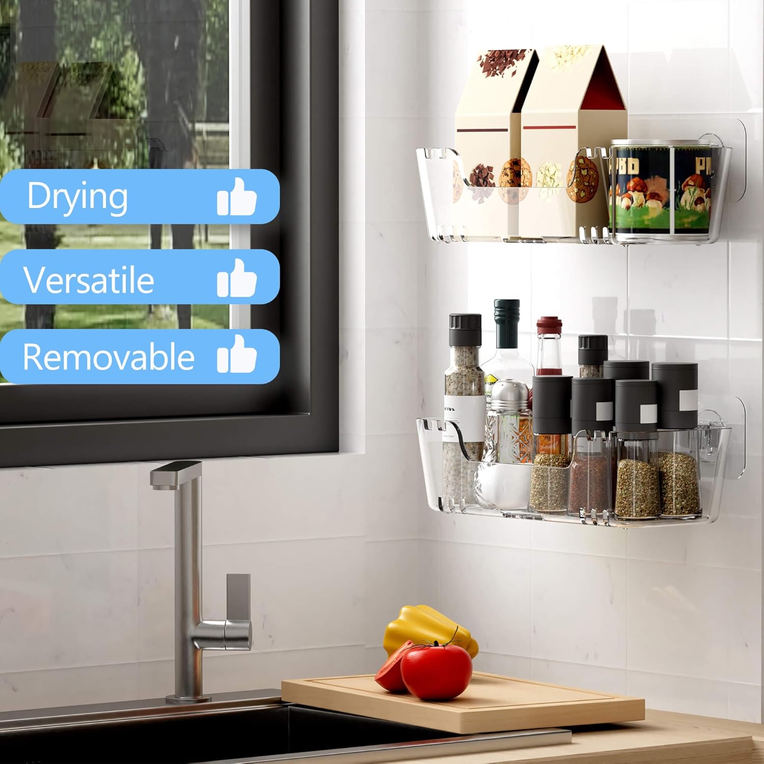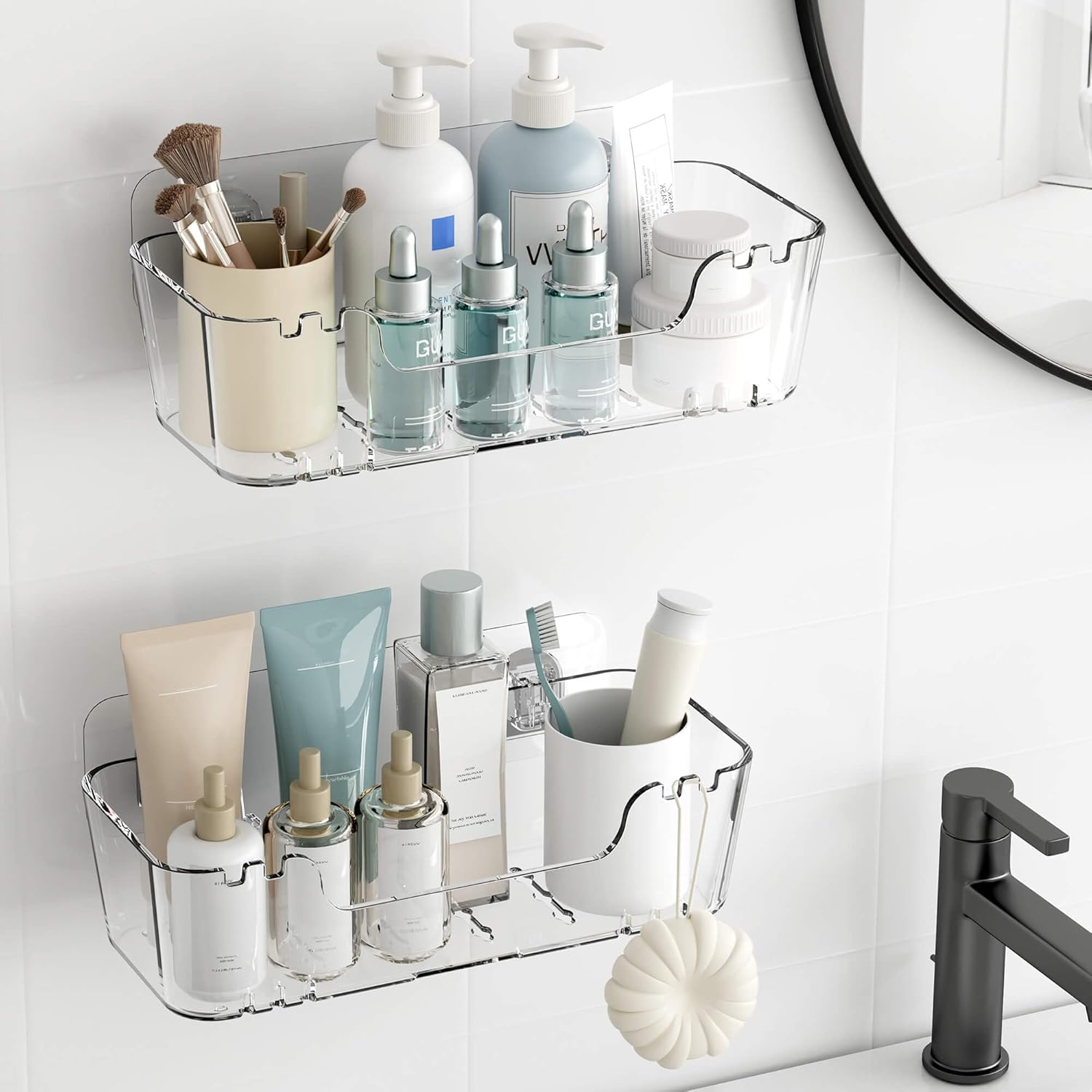 - Practical Adhesive Shelves: The adhesive organizer overall sized 11.62” W x 5.56” D x 4.26”H, large clear acrylic shelf with hook design that creates a lot of wall storage and hanging space for you, helping you save precious countertop space and keep your room neat and organized. Designed with a height of 3.3”, tall bottles are not easy to fall. Ideal for apartment, dorm, cabins, rv, camper, condos and houses