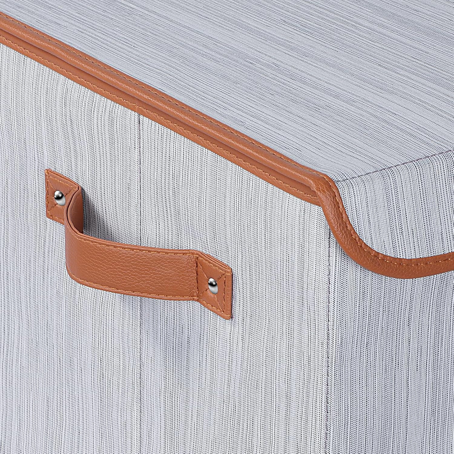 - 【Durable Linen Fabric and Leather Handles】This collapsible storage bins with lid feature a high-quality linen fabric that is odorless and free of chemical residues.Thickened leather handles in three sides are reinforced with double-layer fabric and X-shaped stitching, making it comfortable to carry heavy loads. Its brown leather handles make a stylish decoration that blends well with any home decor, adding an elegant touch.