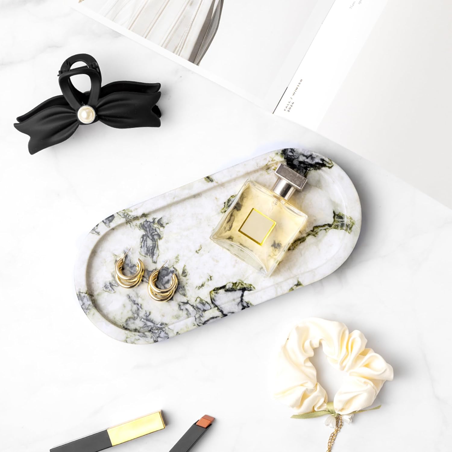 - Versatile and Elegant: This decorative marble tray is not just for display—it's practical too. Use it as a jewelry organizer, perfume holder, or key tray. The non-slip pads underneath prevent scratches on surfaces, ensuring stability wherever you place it. Perfect for bathroom vanities or bedroom dressers