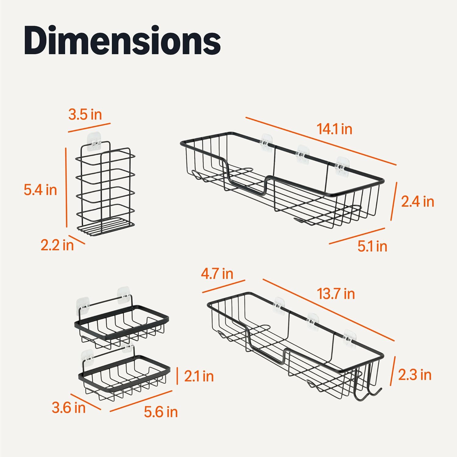 - COMPACT SIZE: Shower caddy measures 13.7 x 5.1 x 2.4 inches and 14.1 x 4.7 x 2.3 inches; soap holder 5.6 x 3.6 x 2.1 inches; brush holder 3.5 x 2.2 x 5.4 inches