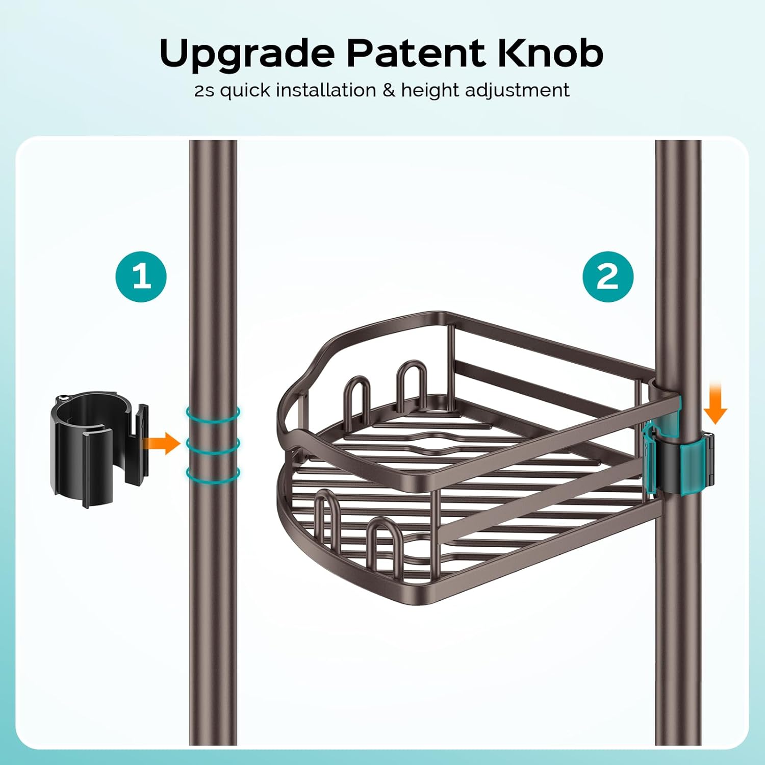 - QUICK INSTALLATION & ADJUSTABLE HEIGHT: This shower caddy features a convenient clip-on design for instant setup and quick height adjustment, saving time and effort while also preventing the tray from slipping. The integrated telescoping Pole has a built-in spring-loaded support, which can be flexibly adjusted, which is stable & non-tipping. The design of this stable structure significantly improves stability and safety.