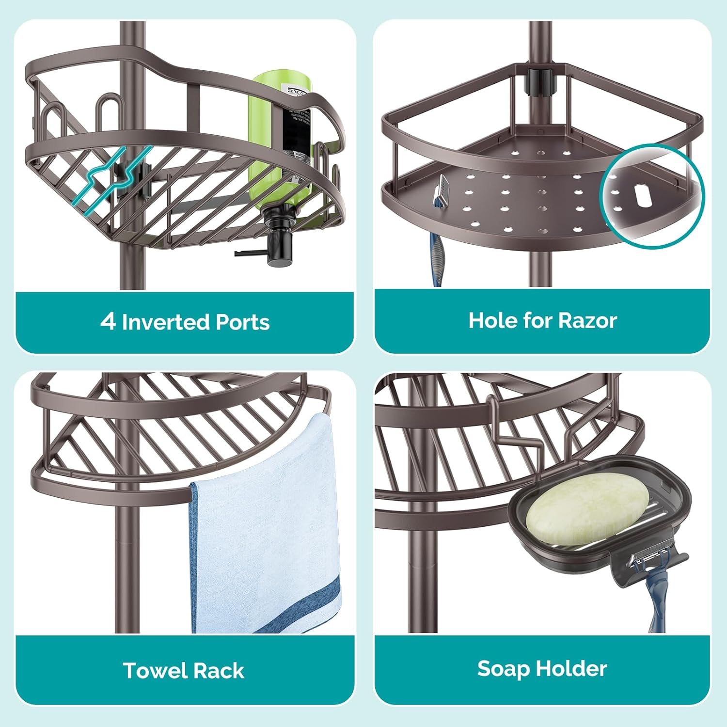 - RUST-RESISTANT STAINLESS STEEL: The shower caddy tension pole is made of premium stainless steel material, which is durable, rust-resistant, moisture-resistant, waterproof, and scratch-resistant, perfect for humid environments. Its hollow design ensures excellent ventilation and drainage, making it easy to clean. The corner shower caddy will be the most durable product you have ever used.