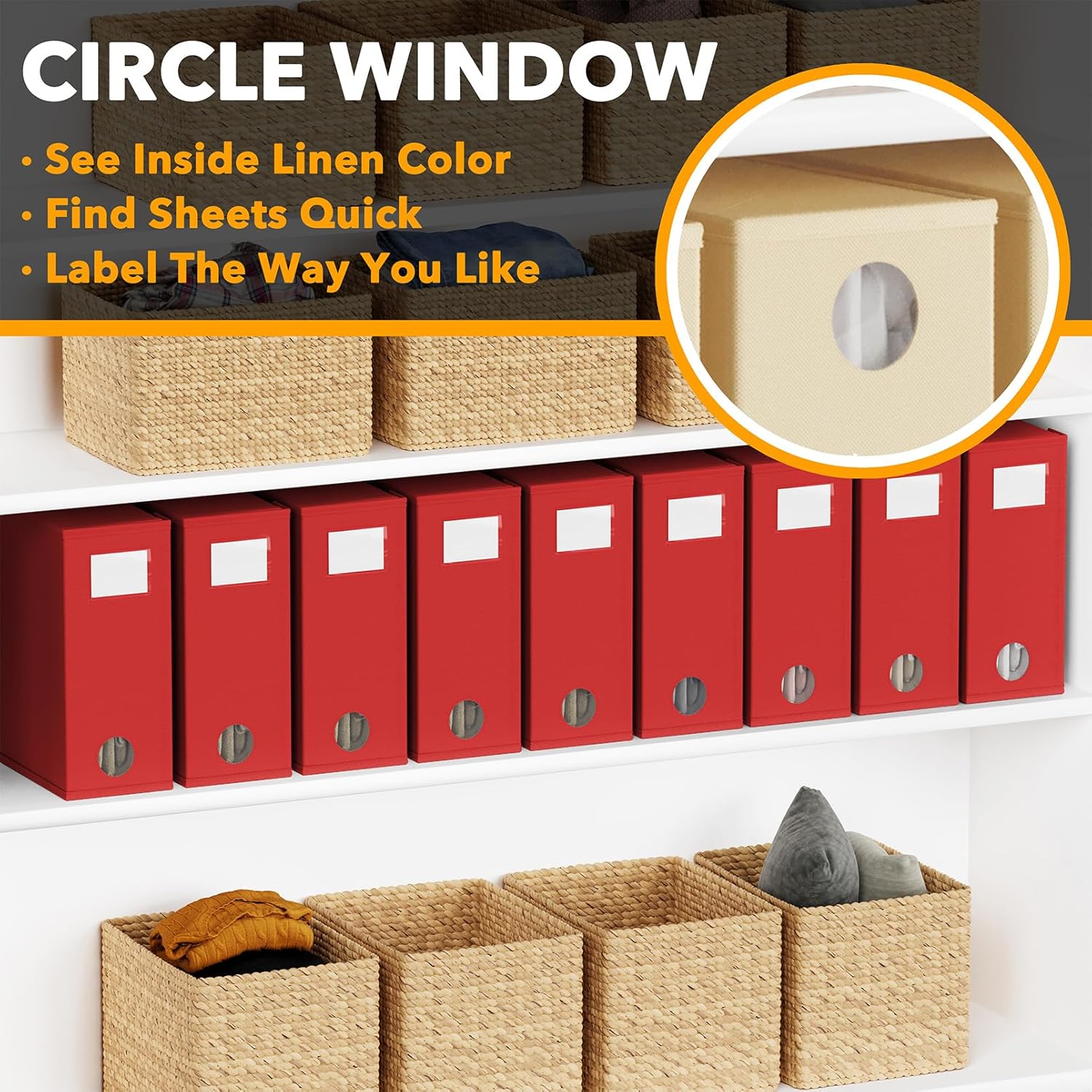 - FRONT CIRCLE WINDOW - The front window design provides a clear view of the linen's color; This modern bed sheet organizer and storage combines beauty and functionality, which will fit any home décor