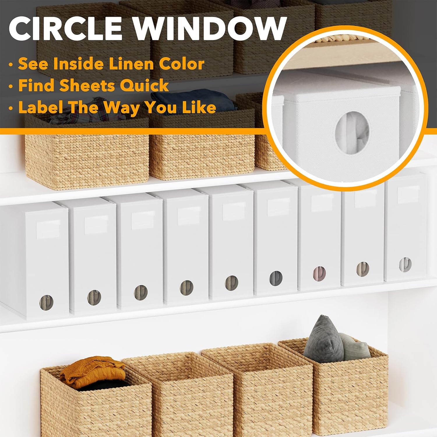 - FRONT CIRCLE WINDOW - The front window design provides a clear view of the linen's color; This modern bed sheet organizer and storage combines beauty and functionality, which will fit any home décor