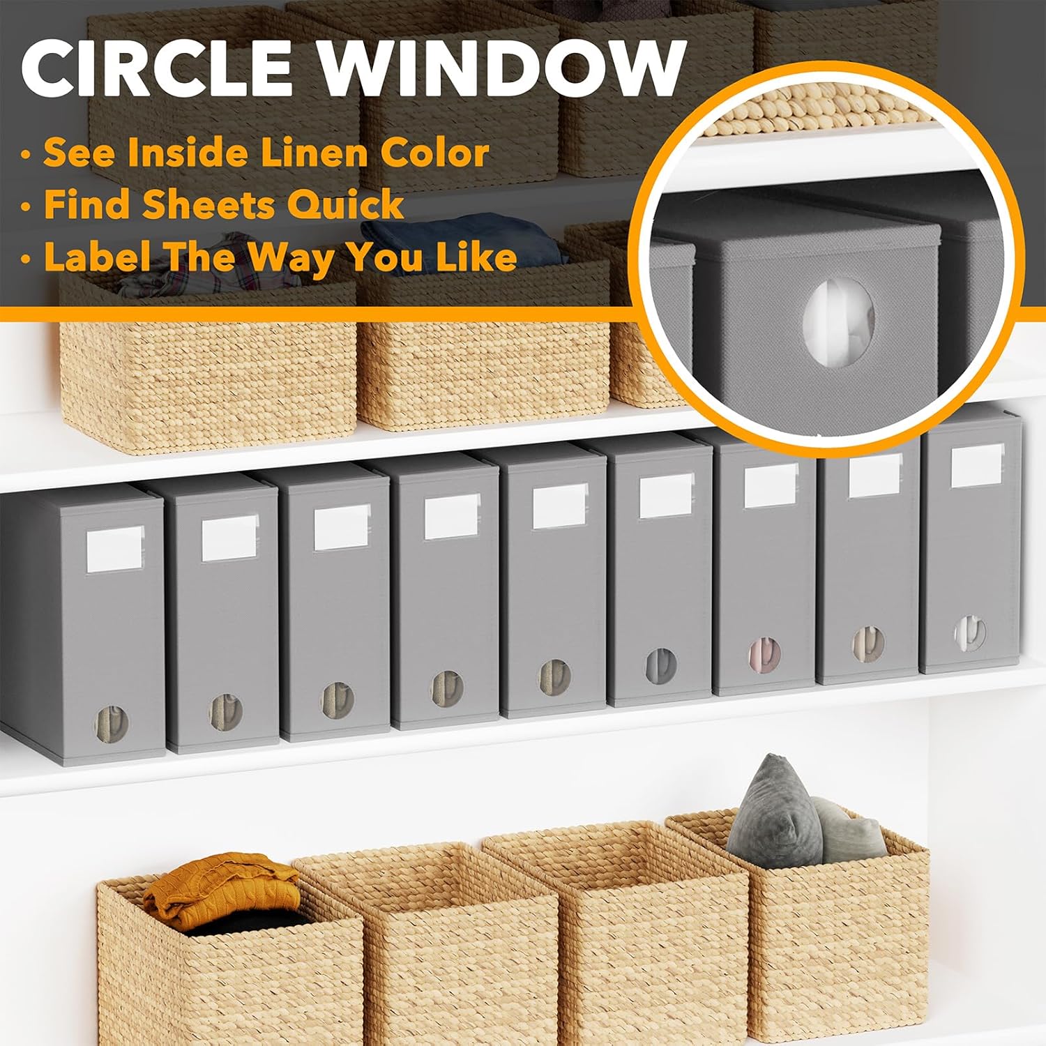 - FRONT CIRCLE WINDOW - The front window design provides a clear view of the linen's color; This modern bed sheet organizer and storage combines beauty and functionality, which will fit any home décor