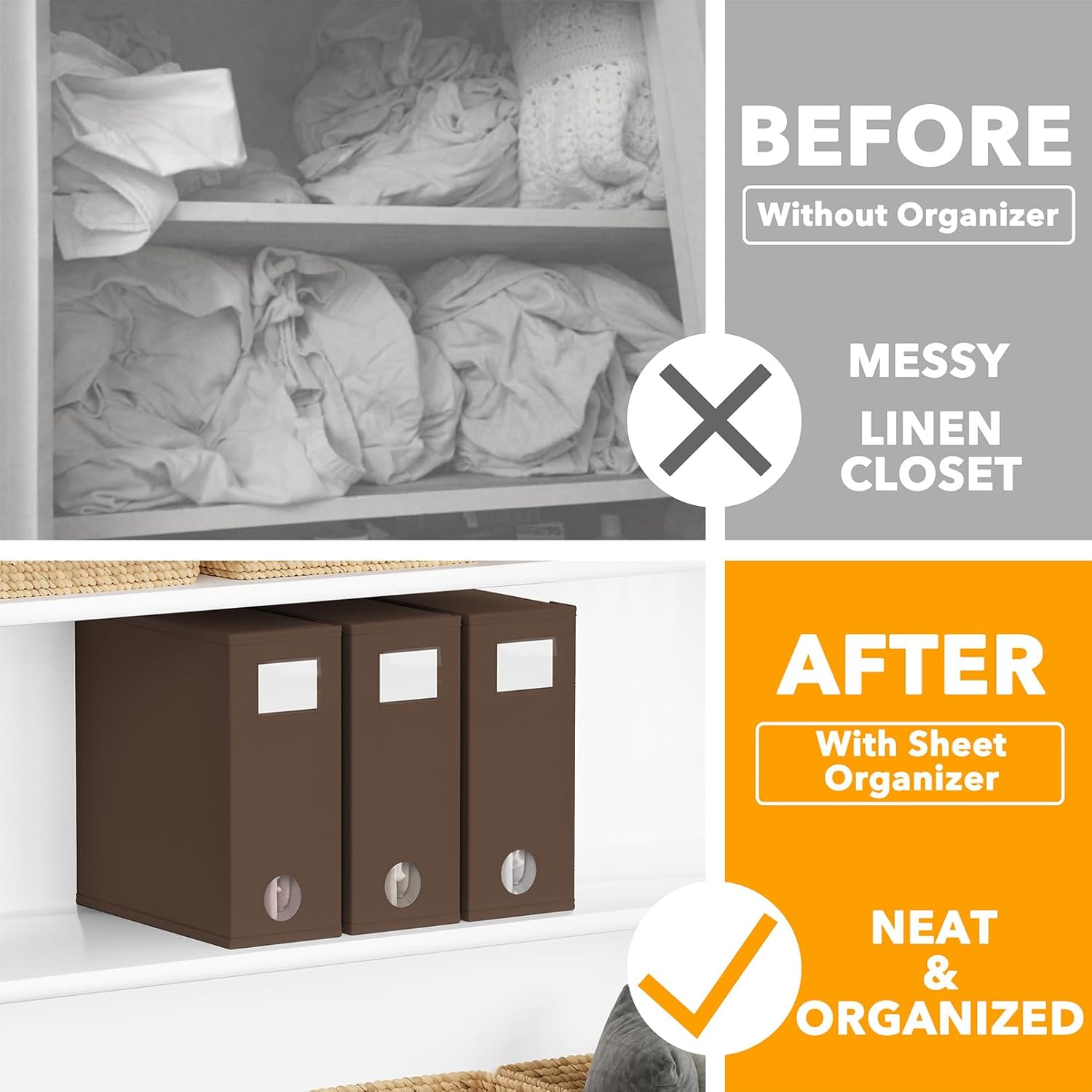 - BROWN SHEET ORGANIZERS 3 PACK - Make your linen closet organized and beautiful with this foldable bed sheet fabric organizer; Each Storage Organizer SIZE: 5"W x 15"D x 12.8"H