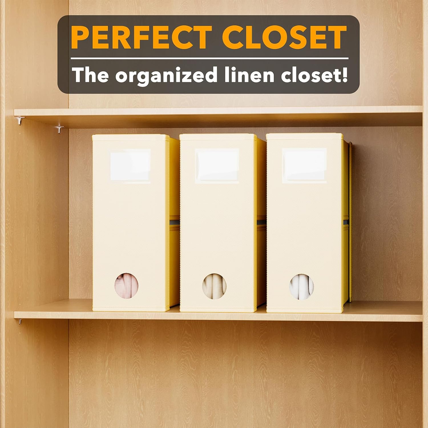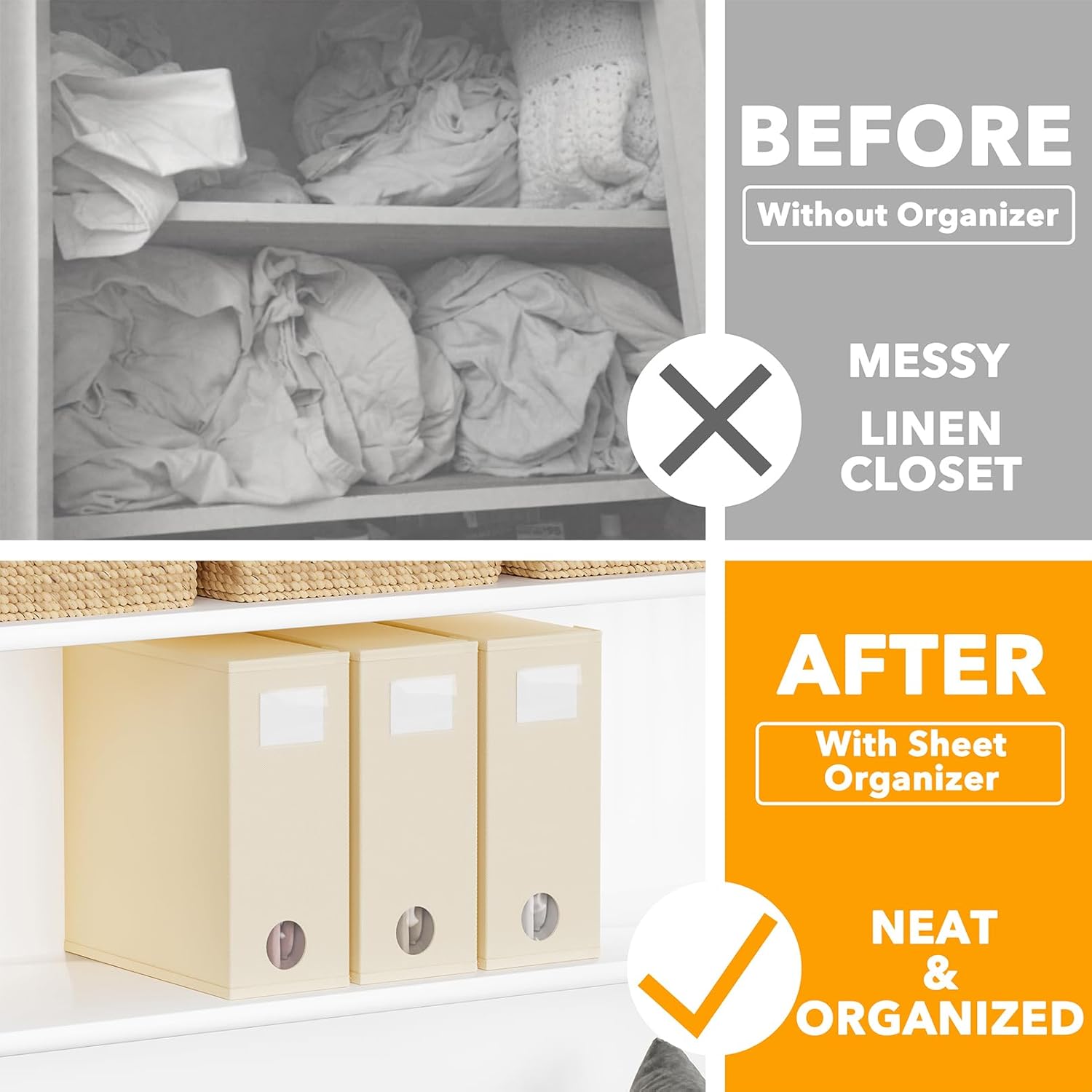 - BEIGE SHEET ORGANIZERS 3 PACK - Make your linen closet organized and beautiful with this foldable bed sheet fabric organizer; Each Storage Organizer SIZE: 5"W x 15"D x 12.8"H