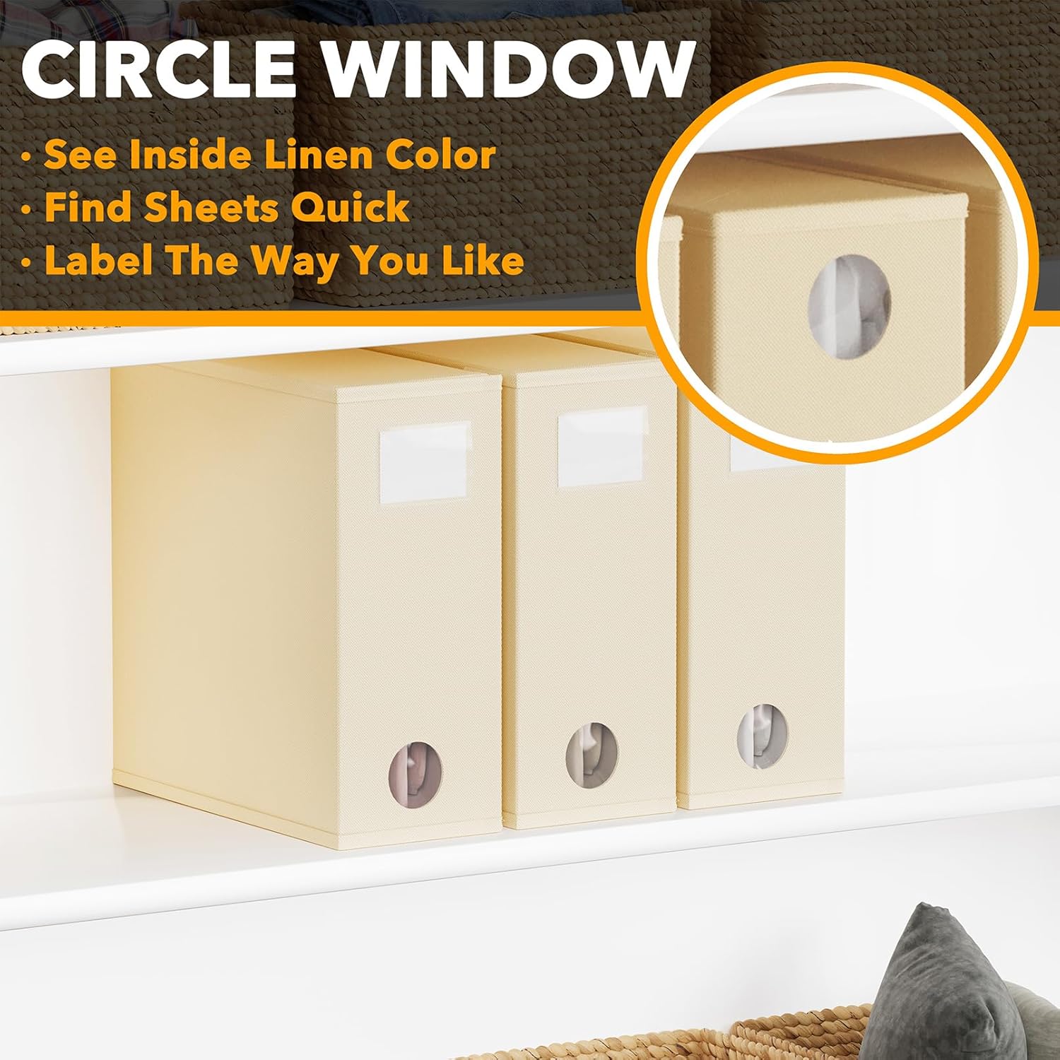 - CIRCLE WINDOW DESIGN - You can see the linen color clearly through the front circle window; This sheets organizer container is beautiful and modern that will fit any home style