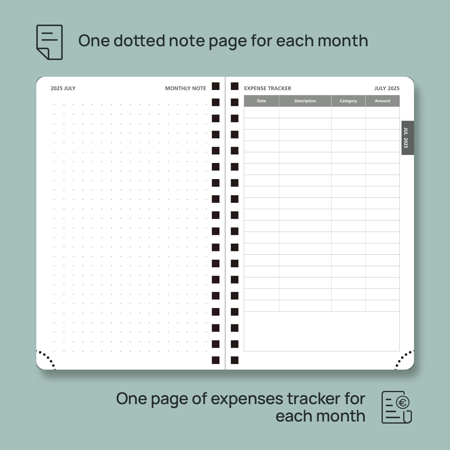 - EXTRA FUNCTION PAGES: This 2025 monthly planner also contains "2025-2026 Yearly Overview" Page + "2025-2026 Holiday & Calendar" Page + Monthly Expenses Page+ Contact & Password Pages + 7 Dotted Notes Pages for jotting down your ideas, thoughts or any other happy things in detail.