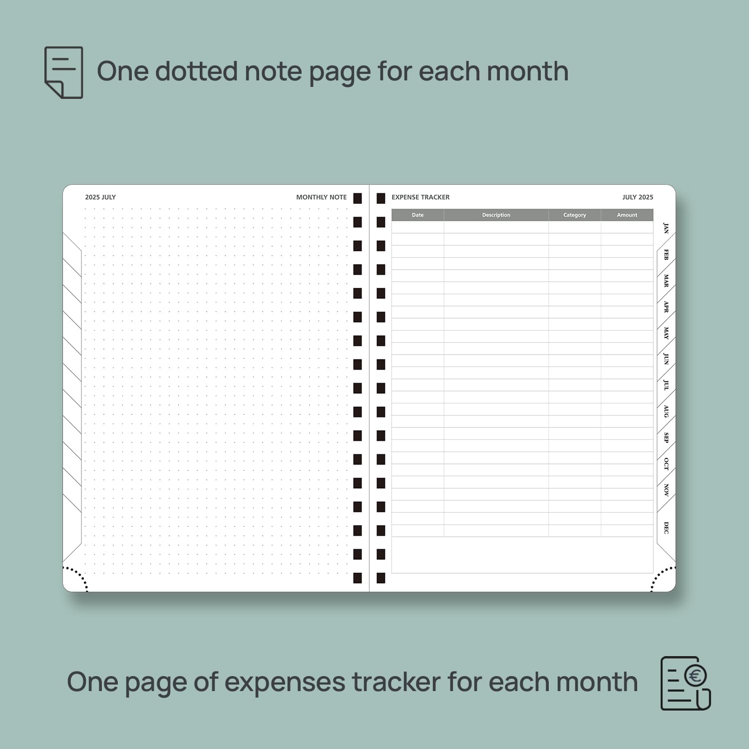 - EXTRA FUNCTION PAGES: This 2025 monthly planner also contains "2025-2026 Yearly Overview" Page + "2025-2026 Holiday & Calendar" Page + Monthly Expenses Page+ Contact & Password Pages + 7 Dotted Notes Pages for jotting down your ideas, thoughts or any other happy things in detail.