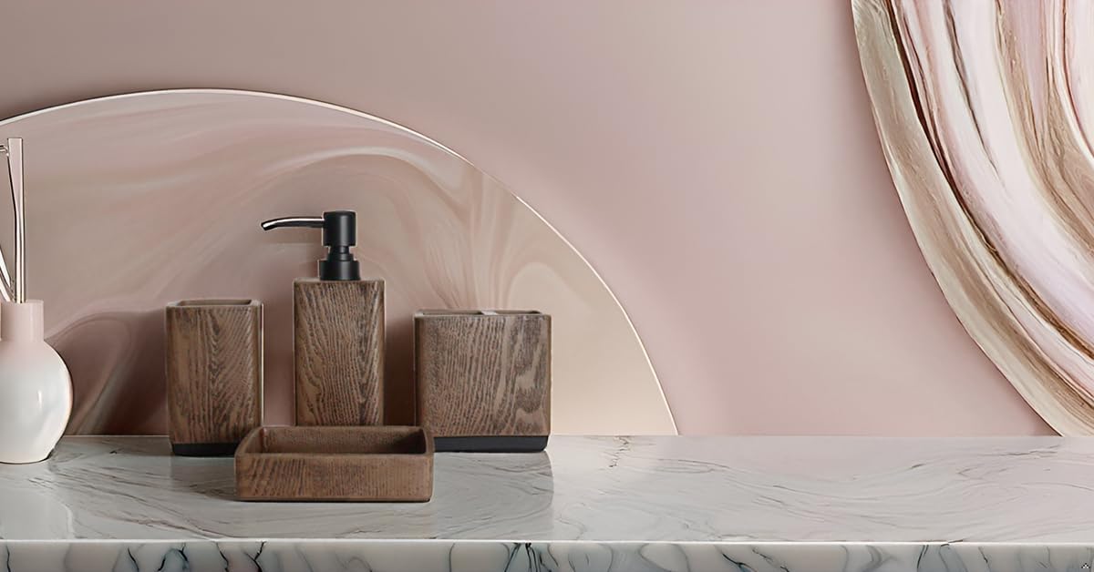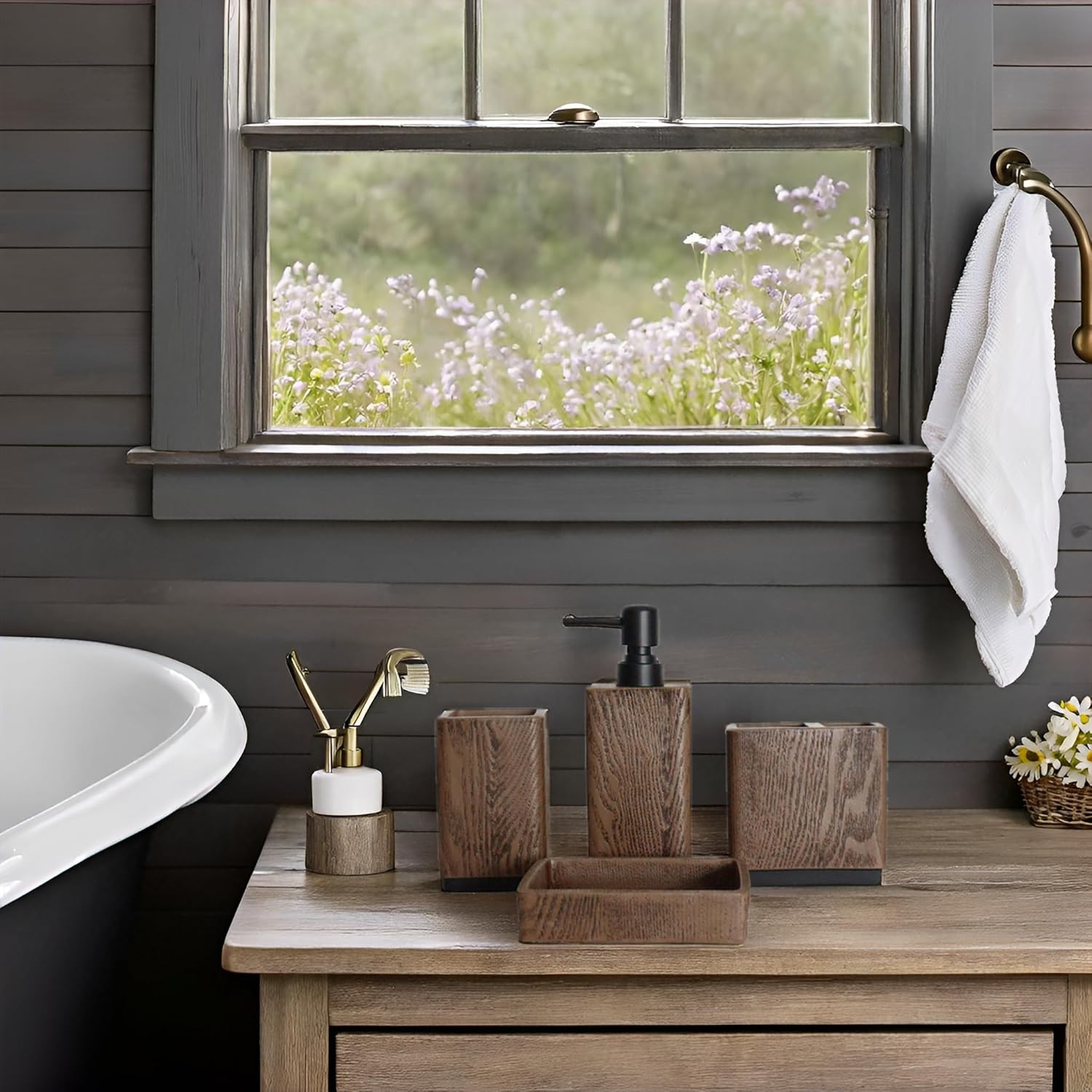 Hymmah Wood Grain Design Bathroom Accessories Set,Farmhouse Bathroom Decor,4 Pcs Resin Gift Set Apartment Necessities, Contain Cotton Swab Jar,Soap Dispenser,Tumbler,Soap Dish/Tray