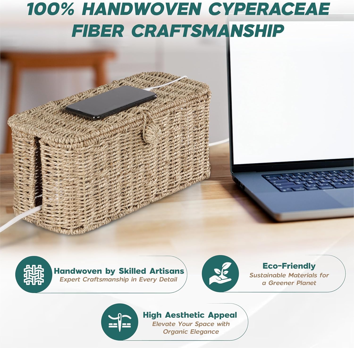 - šæ Crafted from Natural Cyperaceae Fiber: Handwoven by skilled artisans from Vietnam, this cable management box is made using durable and eco-conscious Cyperaceae fibers. Its natural texture showcases the beauty of traditional craftsmanship, ensuring both strength and sustainability.