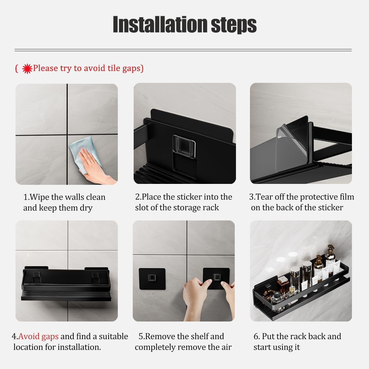 - (About load-bearing): The bathroom storage rack adopts a back-adhesive card slot design, which fits seamlessly with the wall and will not shake. It has a strong load-bearing capacity of up to 20KG and is stable and reliable. (After installation, please note that you need to take down the shelf and squeeze the surface of the patch by hand to expel the air)