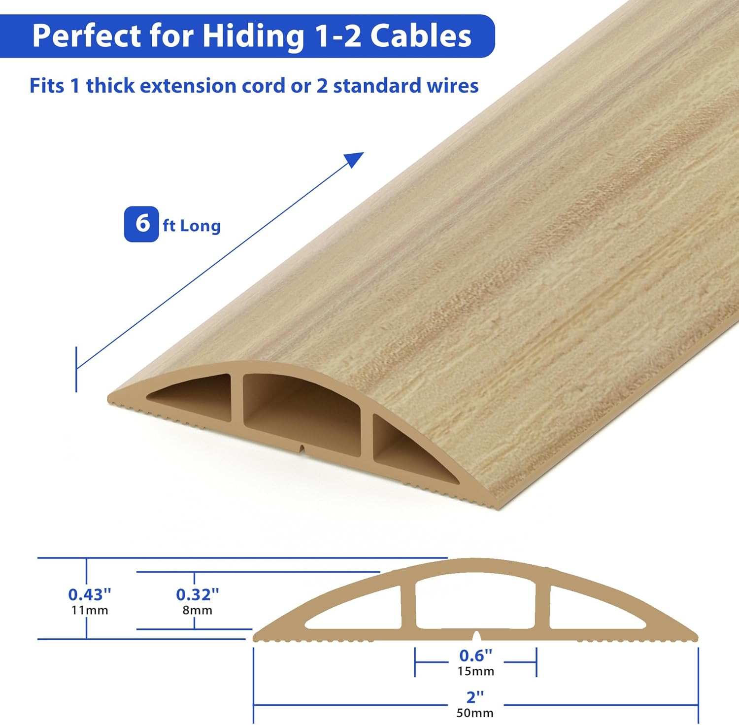 - ZhiYo Floor Cord Hider: Dimensions: 2 inches (width) x 0.43 inches (height), 6 feet in length - Inner Channel: 0.6 inches (width) x 0.32 inches (height). Note: The height or diameter of the concealed cables must be less than 0.37 inches (9.5 mm). Please measure your cables before ordering