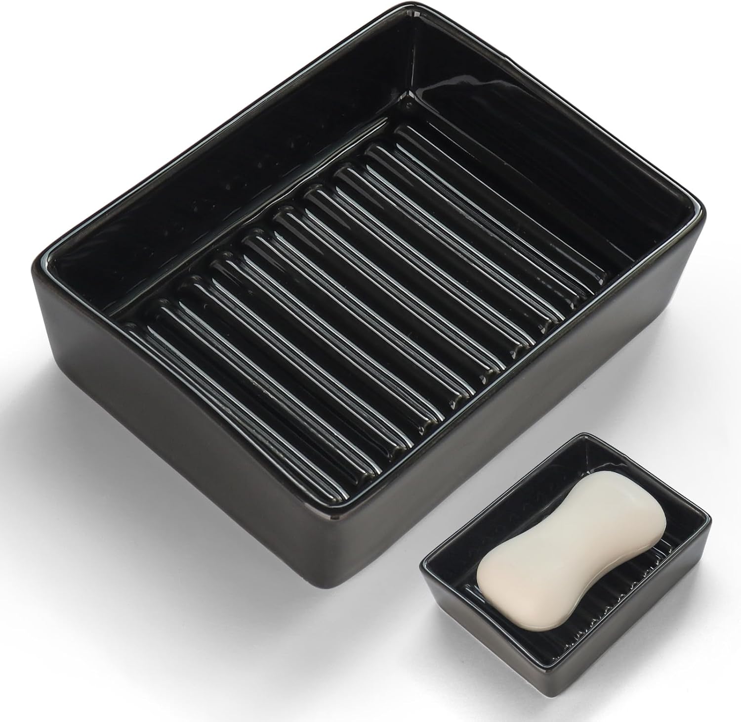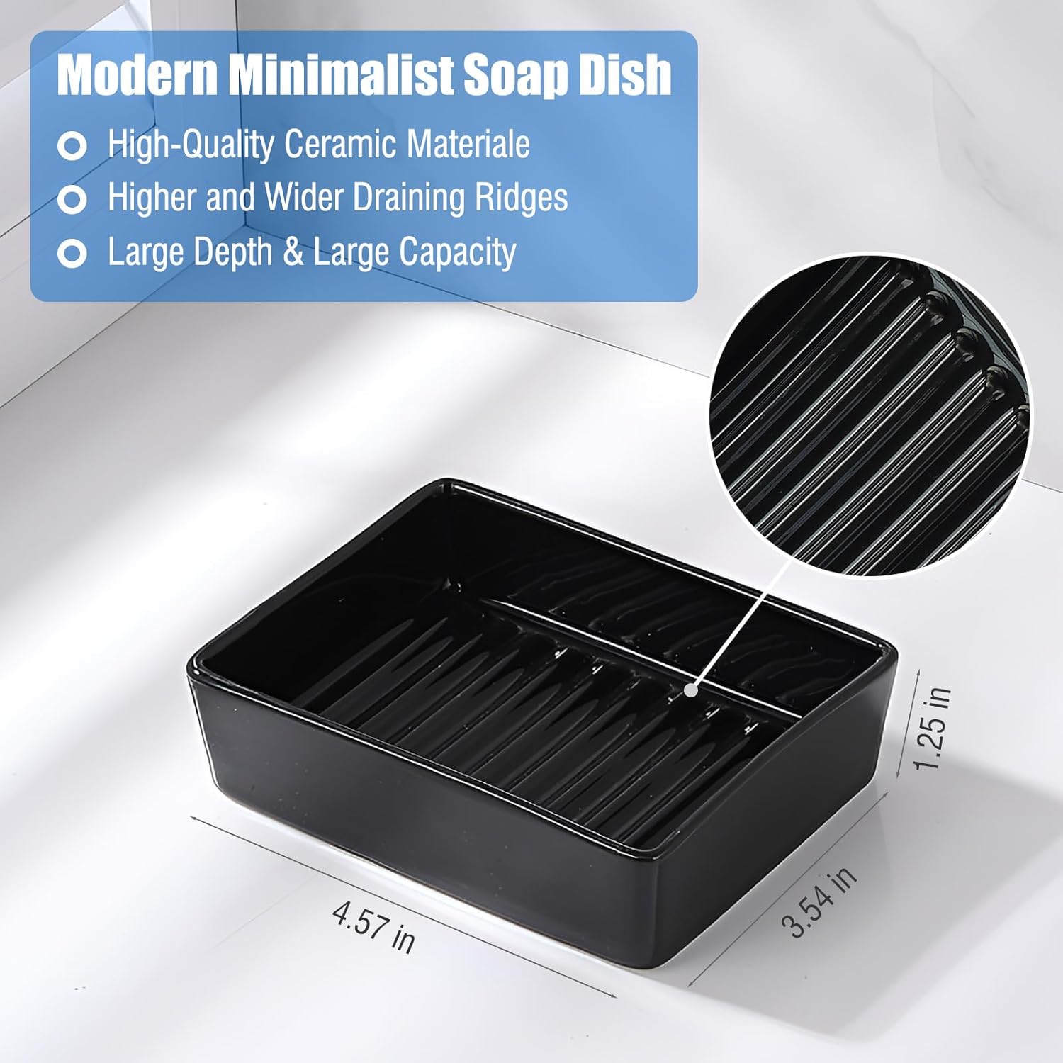 Black Ceramic Soap Dish, Minimalist Soap Holder with Higher Draining Ridges, Multi-Purpose Soap Bar Holder for Bathroom Sink, Shower, Kitchen, Easy to Clean