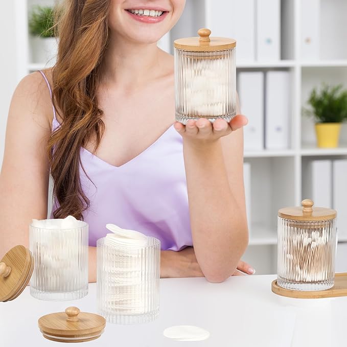 - LONG-LASTING AND CONVENIENT ORGANIZER: This cotton ball holder use thickened glass material, won't be easy to crack like plastic, clear transparent glass design, let you know at a glance what is loaded, waterproof and non-slip tray, keep your containers and items in place, not a mess, no longer need to look for them everywhere, bamboo lid handle ergonomically designed and built-in reinforcement screws, very comfortable and easy to hold steady, will not fall off easily like others.
