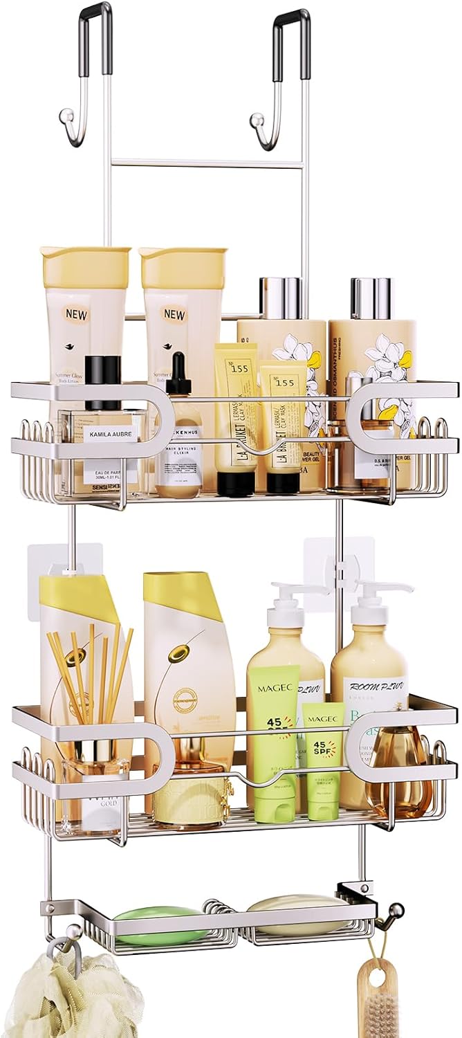 - [Large 3-Tier Capacity for All Essentials]: Our shower caddy hanging offers three spacious baskets that hold shampoo, conditioner, body wash, razors, and towels, keeping your bathroom organized and clutter-free. Ideal for small bathrooms, shared spaces, or family use, the shower shelves turn vertical space into convenient storage