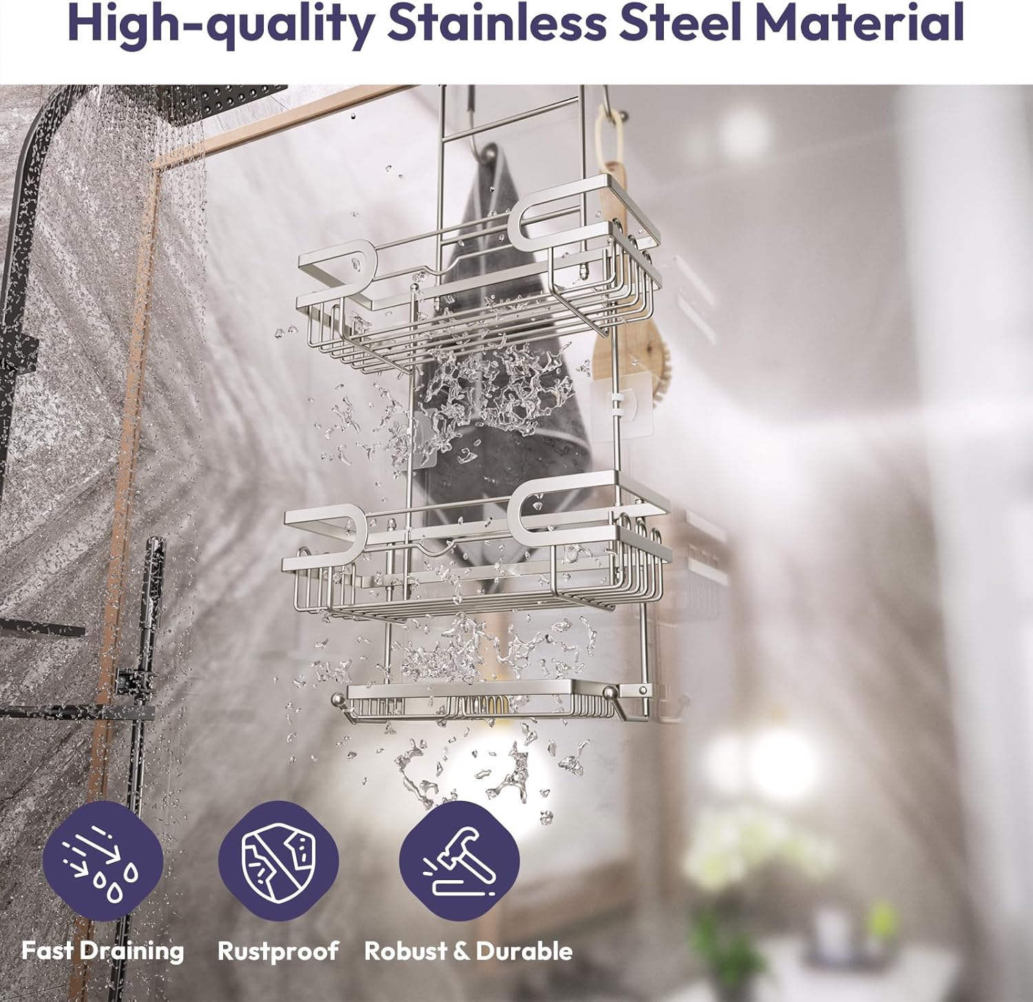 - [Rustproof Stainless Steel for Long-Term Use]: Crafted from premium 304 stainless steel, our shower organizer hanging is designed to be rustproof and durable. Perfect for humid environments, this shower shelf remains shiny and functional even after prolonged use