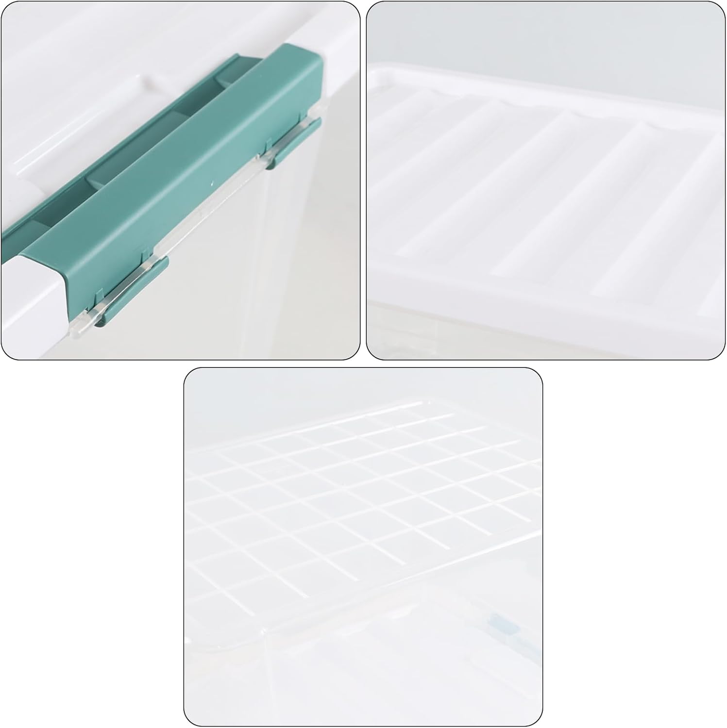 - The plastic bin is designed with two green latches to secure the lid and prevent dust from entering