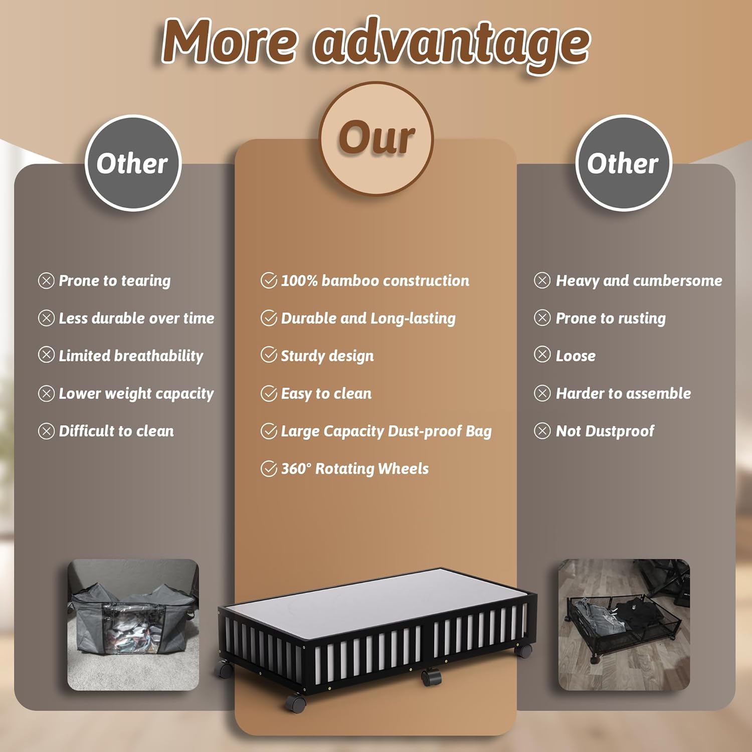 - ๐ฆ๐๐๐ฟ๐ฑ๐ ๐ฎ๐ป๐ฑ ๐๐๐ฟ๐ฎ๐ฏ๐น๐ฒ ๐๐ผ๐ป๐๐๐ฟ๐๐ฐ๐๐ถ๐ผ๐ป: Our under bed drawers on wheels is crafted from 100% Real bamboo, ensuring long-lasting quality and a stylish, natural aesthetic that complements any bedroom decor. Equipped with 6 rotating wheels, each capable of bearing up to 120 pounds. The large-capacity dustproof bag is designed for storing seasonal clothing, bedding, and household items. It's a versatile storage solution that can be customized based to your needs.