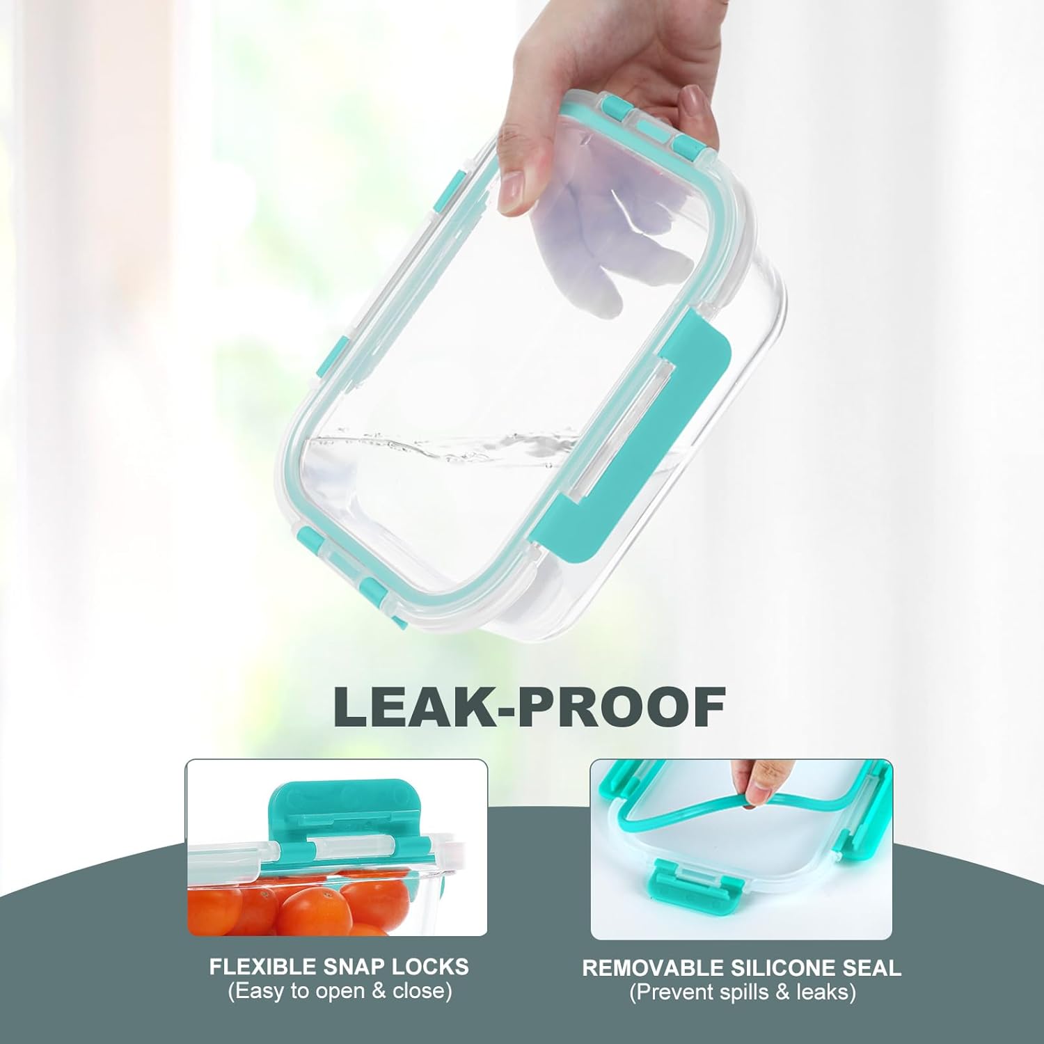 KOMUEE 10 Pack Glass Food Storage Containers, Meal Prep Containers with Lids, Airtight Glass Lunch Boxes, Freezer, Oven, and Microwave Safe, Green