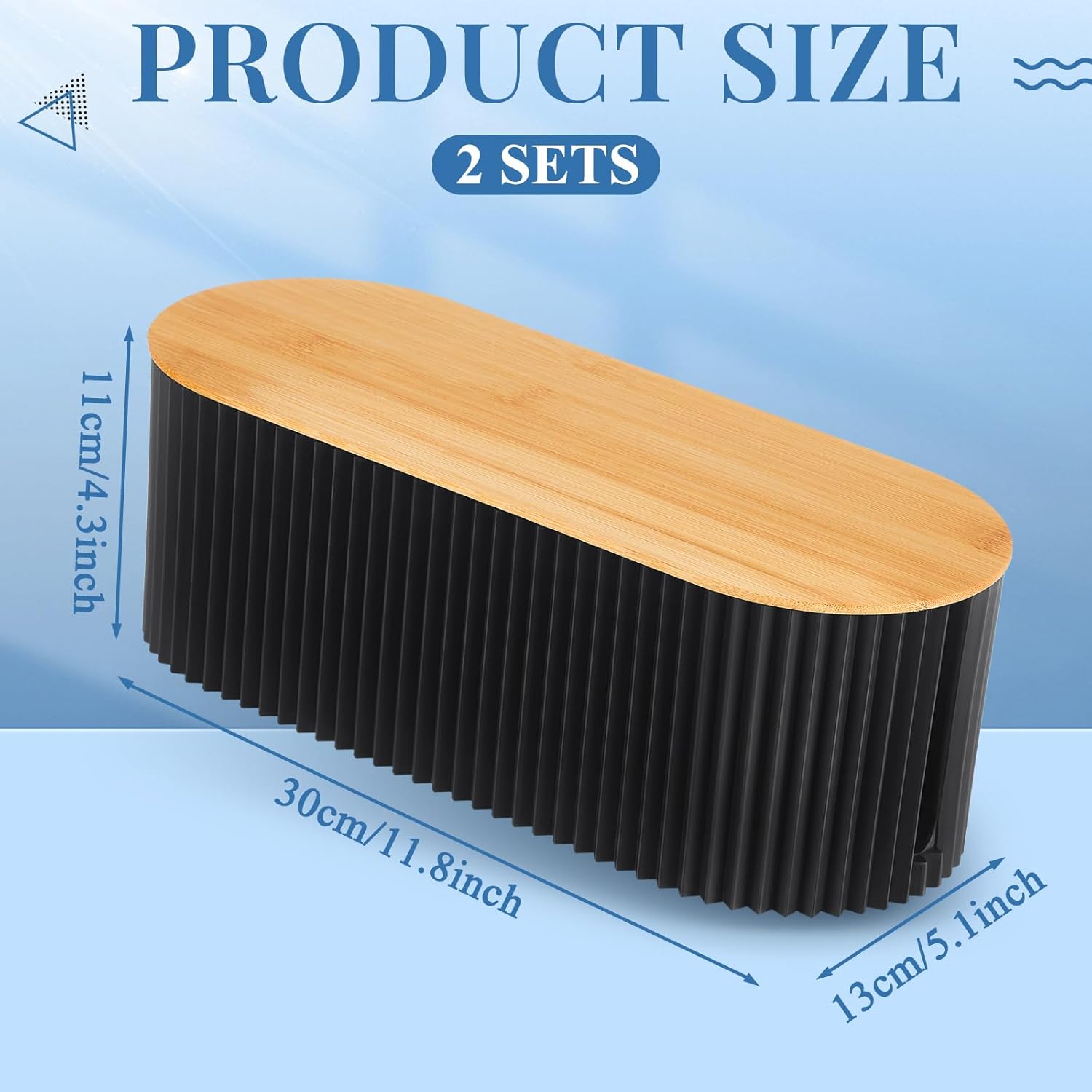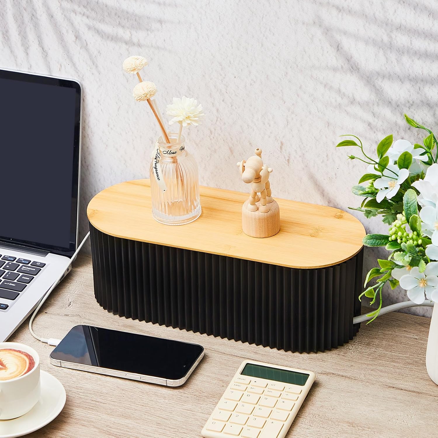 - And Stylish Design: the Cable Management Box is crafted meticulously from plastic ensuring durability and resistance to wear; The lid is made of wood that offers firm and secure protection, all in a sleek black color; Its size of 11.8 x 5.1 x 4.3 inches (or 30 x 13 x 11 cm) makes it compact yet spacious for various cable types; Its design is a blend of functionality and style, perfect for modern spaces