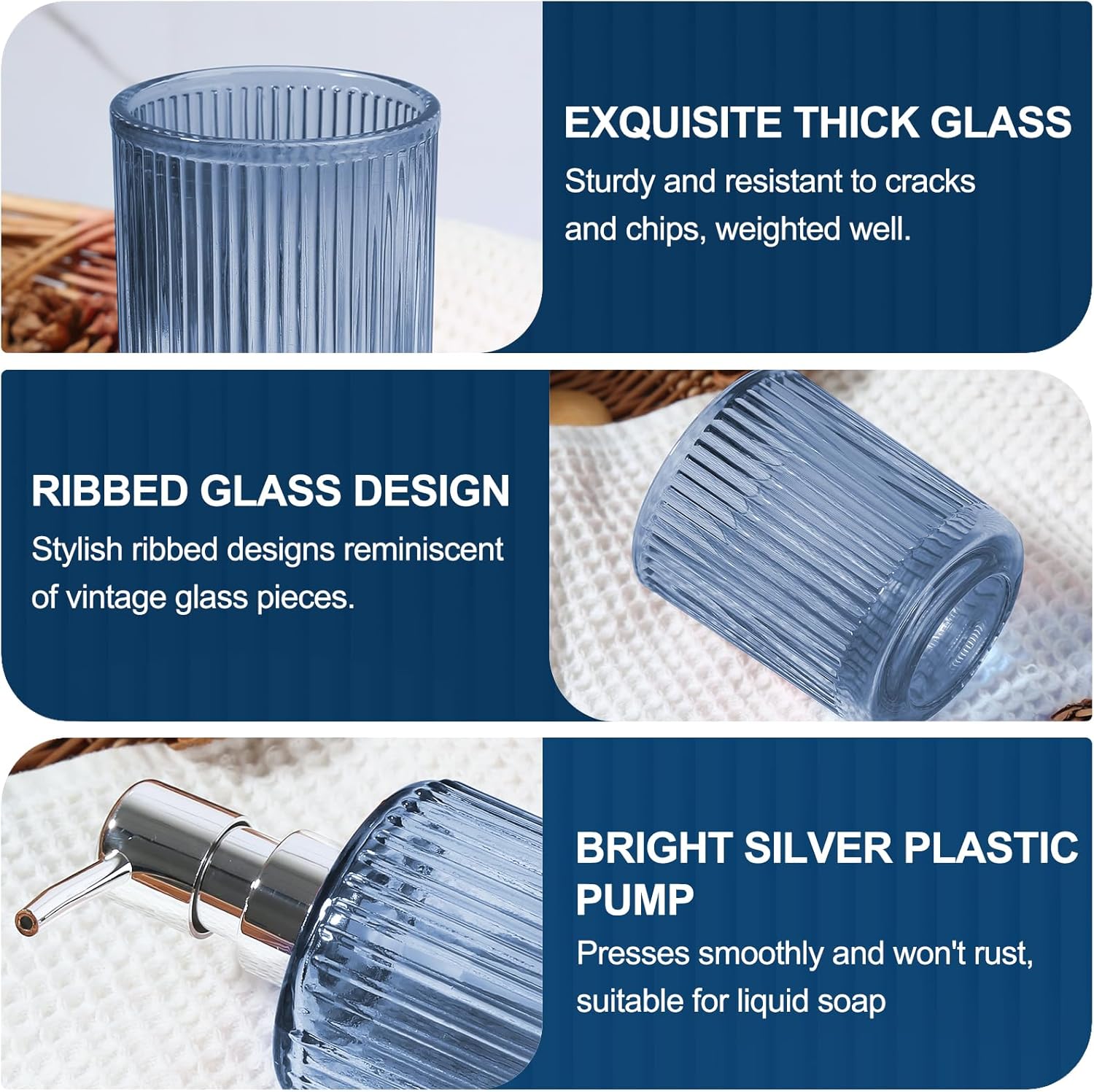 - 【Sturdy Heavy Cut Glass】The navy blue bathroom accessories set is made of thick glass, which adopts a retro ribbed design, and the glass uses diamond cutting technology. Blue glass bathroom accessories are exquisite and translucent with bright colors, creating a retro and warm atmosphere in the bathroom. The plastic pump avoids leakage and rusting over time and also ensures that the soap dispenser is easy and comfortable to use.