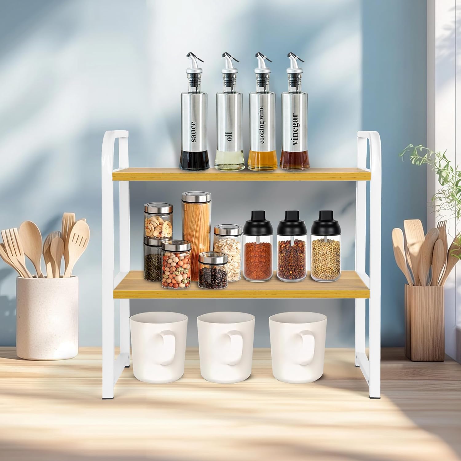 Desktop Shelf Organizer, 2-Tier Office Desk Shelf for Top of Desk, Wood & Metal Bookshelf Supplies Storage Rack (White&Walnut)