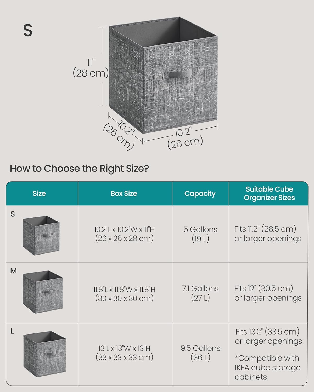 - Fit Cube Storage Organizers: Sized at 10.2"L x 10.2"W x 11"H (26 x 26 x 28 cm), these boxes fit nicely into a cube storage organizer with 11.2" (28.5 cm) or larger openings, hiding the mess and keeping items easily accessible