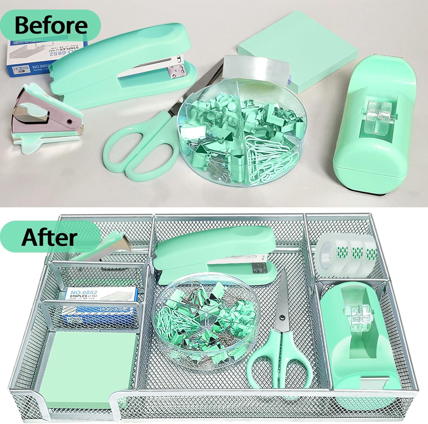 Green Office Desk Accessories, Green Office Supplies Set, Desk Drawer Organizer,Stapler and Tape Dispenser Set,Tape,Staple Remover, Staples, Paper Clips, Scissor and Sticky Note