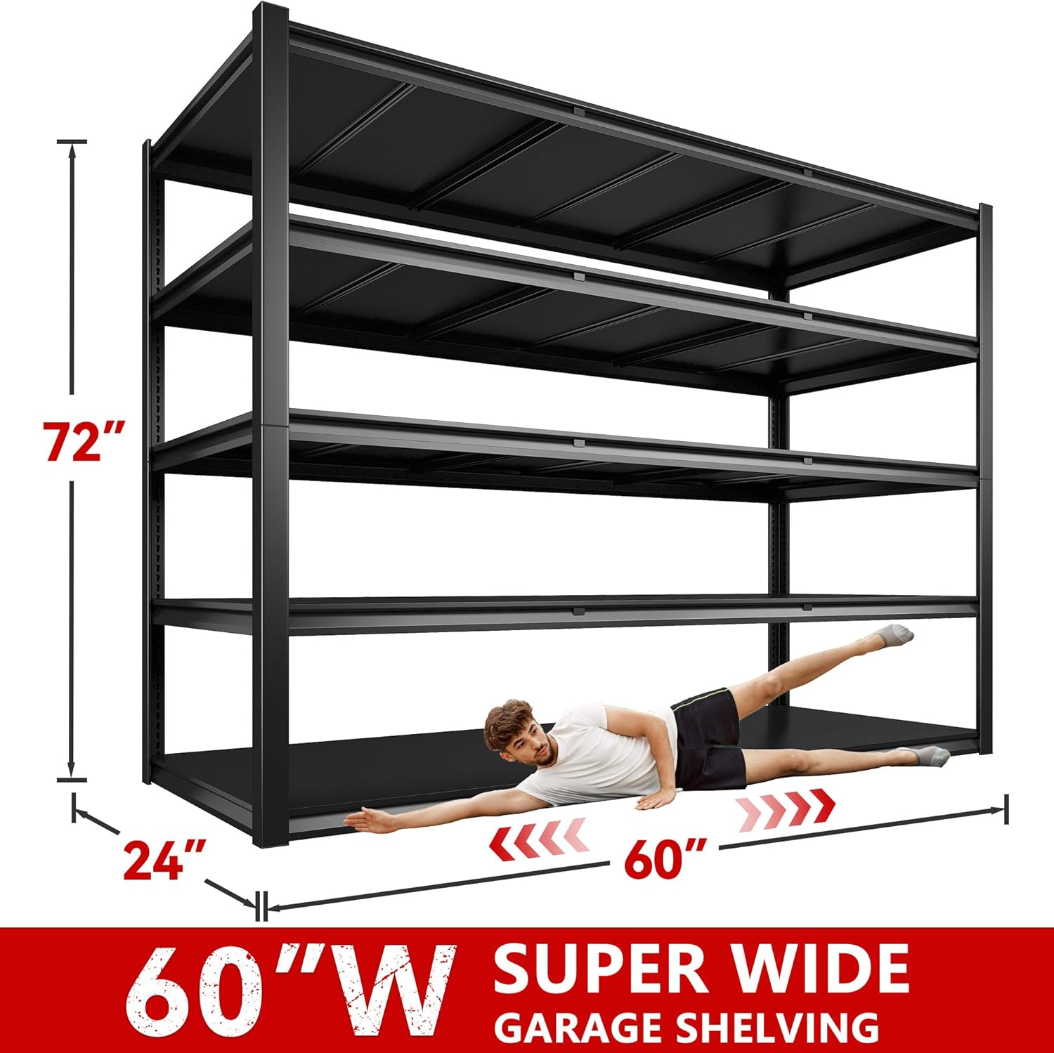 - 【60 "W Garage Shelving Heavy Duty】The garage shelving are 60"W x 24"D x 72"H, the extra wide storage shelves is suitable for garage, warehouse, basement, pantry and etc.At the same time, the garage shelving can be used as an industrial shelving or commercial shelving, ideal for storing heavy goods such as tire generators or motor oil crates.Built for mechanics, warehouse pros, and heavy-duty organizers.