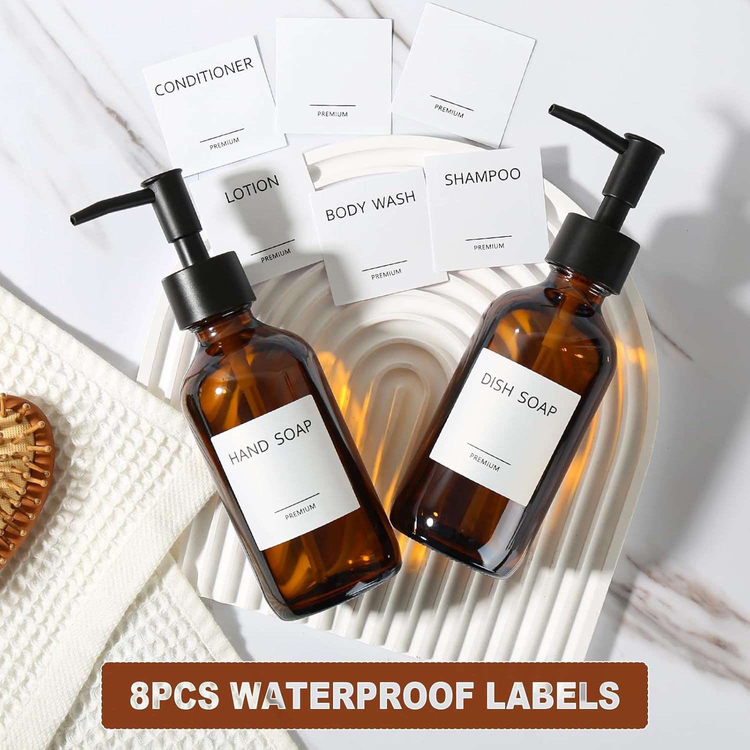- 【VALUE 4 PACK AMBER SOAP DISPENSER】Amber glass soap dispenser set includes 4 refillable glass bottles 8 fl oz, 4 plastic pumps and 8 waterproof label. If you're looking for a cost-effective glass pump bottle set, look no further.