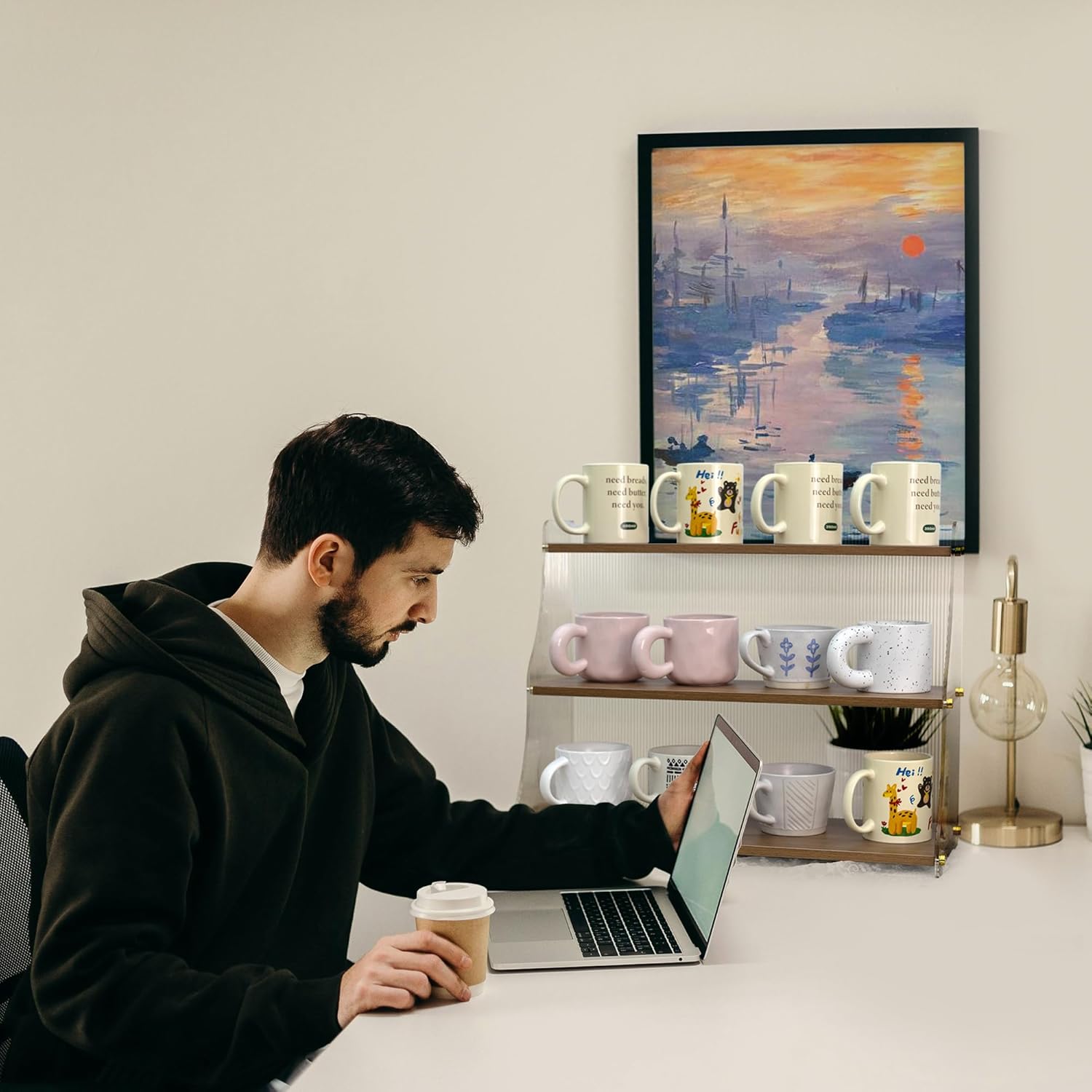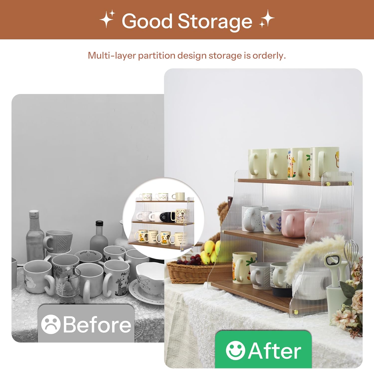 - 3-Tier Space-Saving Solution Wooden Cup Holder: 19.9*7.8*15.8 inch. The Wooden Coffee Cup Holder is designed to efficiently organize coffee cups. Optimize countertops with open shelves designed to hold mugs, coffee bar accessories, plants, or decor. Lightweight yet sturdy, it organizes clutter while displaying items with easy-access visibility.Whether it's your kitchen, office, or cafe, it will help you maintain a neat and tidy environment., with each tier spaced to ensure stability and ease of access.