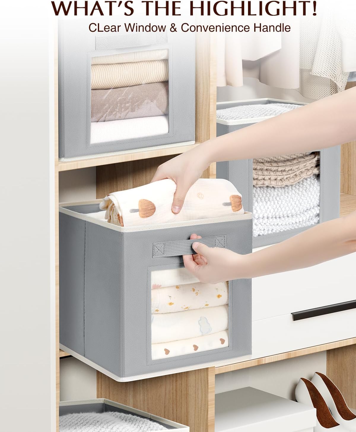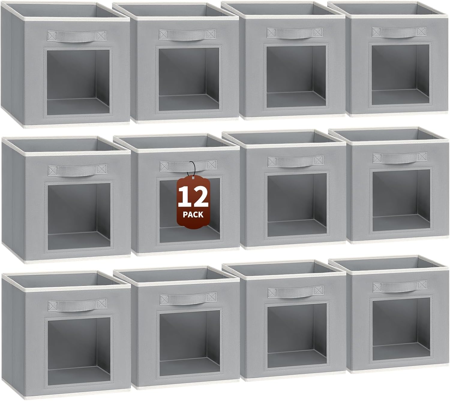 Foldable Storage Cubes - Cubby Storage Organizer with Window, Decorative Baskets for Organizing, Fabric Bins for Clothes Storage, Closet Storage Cubes 11inch, Set of 12, Grey