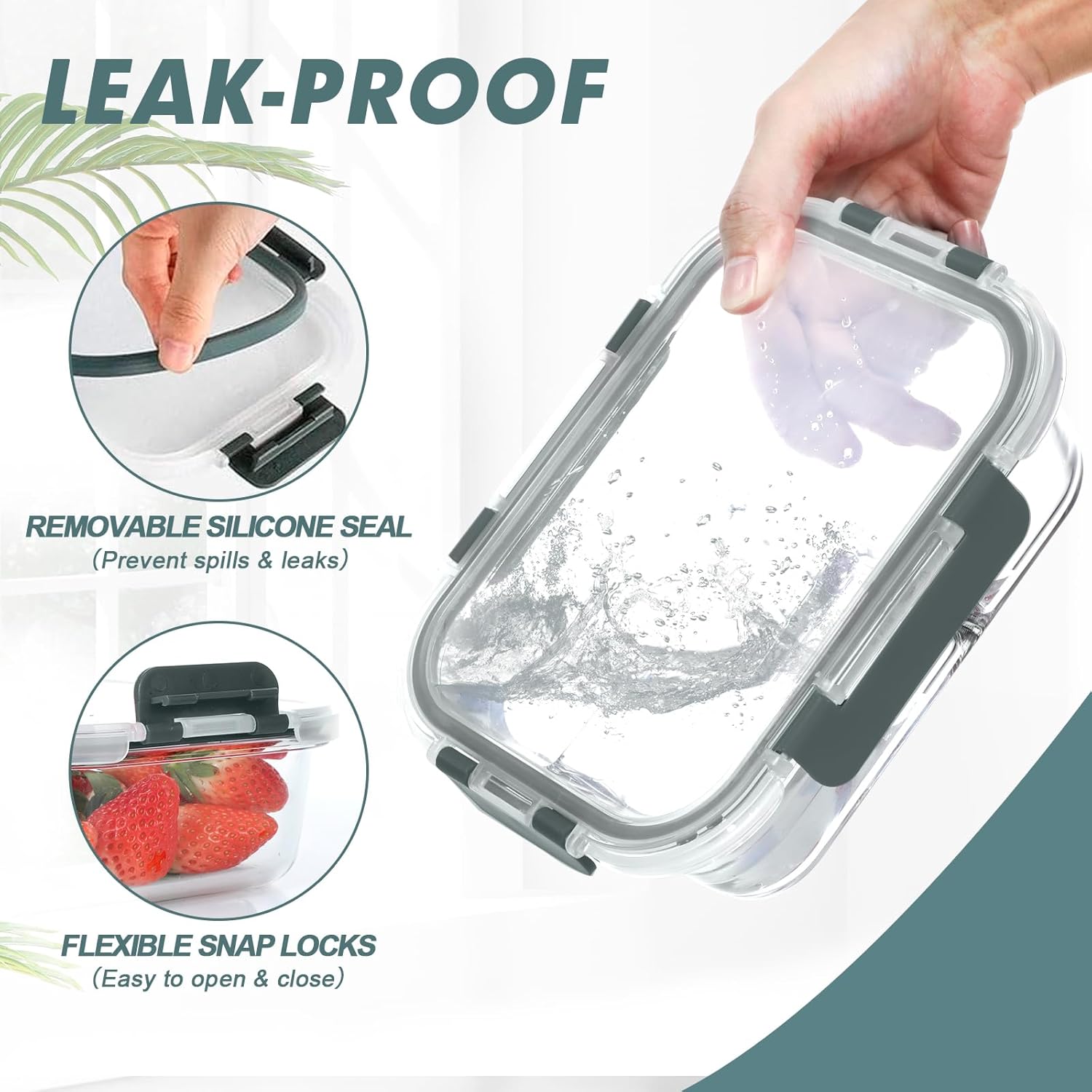 - AIRTIGHT SEAL: Each glass storage container comes with a BPA-free plastic lid featuring a silicone ring that provides a leak-proof seal. This prevents spills and keeps food fresh longer, ideal for carrying meals to work, picnics, or the gym. The snap locking lids are easy to use and won’t break easily.