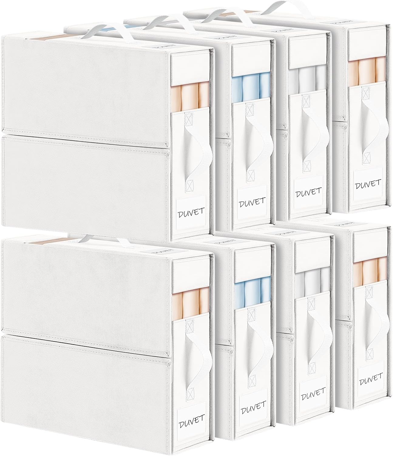 DIMJ Bed Sheet Organizers and Storage 8 Pack - Foldable Sheet Organizer for Linen Closet, Bedding Storage Box for organization, Sheets Set Holder for Blanket, Towel (King & Queen Size), White