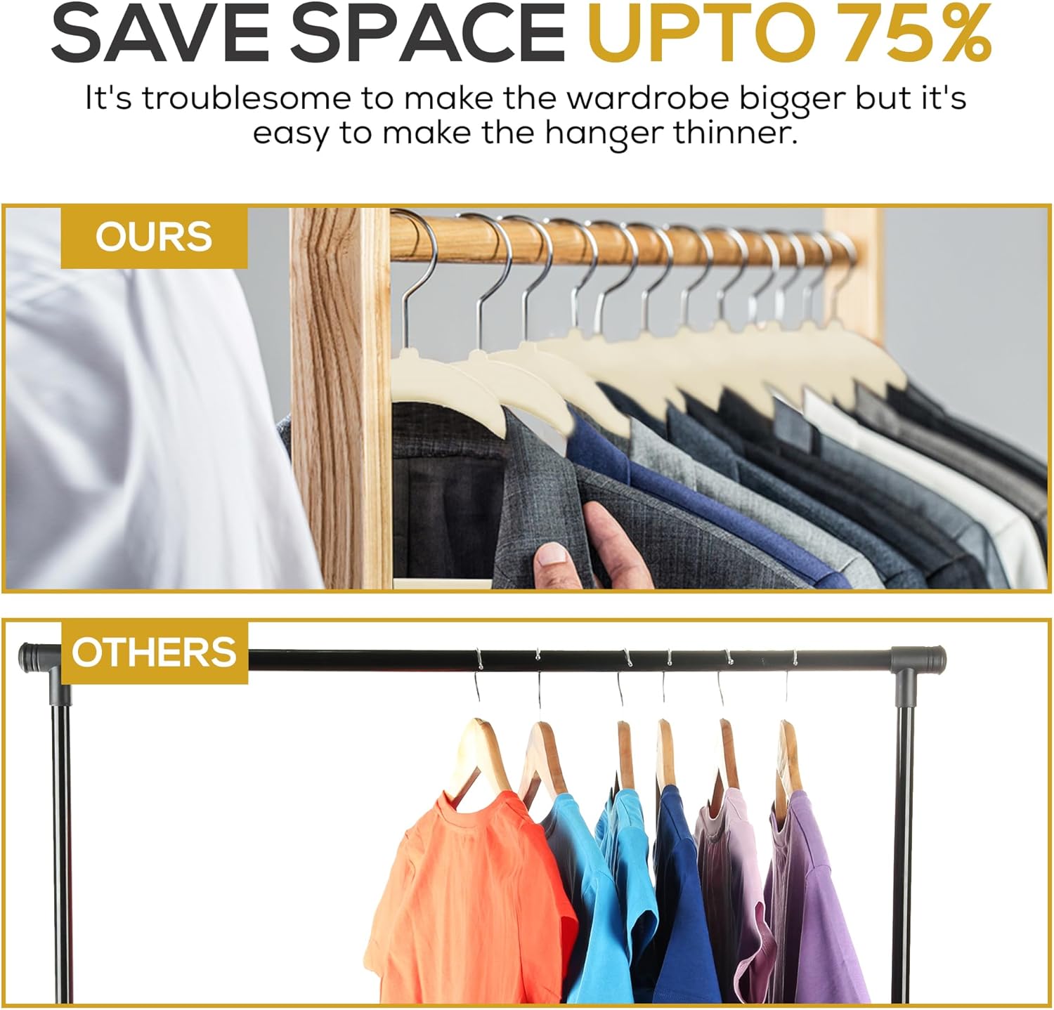 - MAXIMIZE CLOSET SPACE : Transform your closet with these space saving thin & slim hangers. Their ultra thin design 1/4” width allows for maximum storage space, giving you 50% more space in your wardrobe. Each hanger measures 17.7"L x 9"H and features a 360 degree swivel galvanized metal hook for easy sorting and hanging.